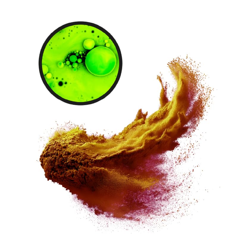 Groene vloeistof met bordeauxrood poeder, mogelijk natuurlijke ingrediënten of smaakcomponenten voor een voedings- of drankproduct.