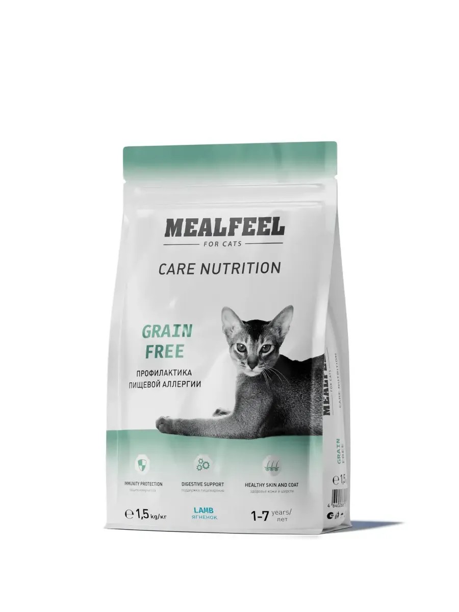 Mealfeel Care Nuntrition GRAIN FREE с ягненком – полнорационной беззерновой корм предназначен для питомцев с аллергией на злаки, с чувствительным пищеварением. Отсутствие злаков в корме снижает риск пищевой непереносимости, аллергии, способствует улучшению усвояемости пищи и нормализации уровня сахара в крови. Подходит для стерилизованных кошек и кастрированных котов. Корм позволит улучшить состояние здоровья питомца, что благотворно влияет на уровень и продолжительность жизни.