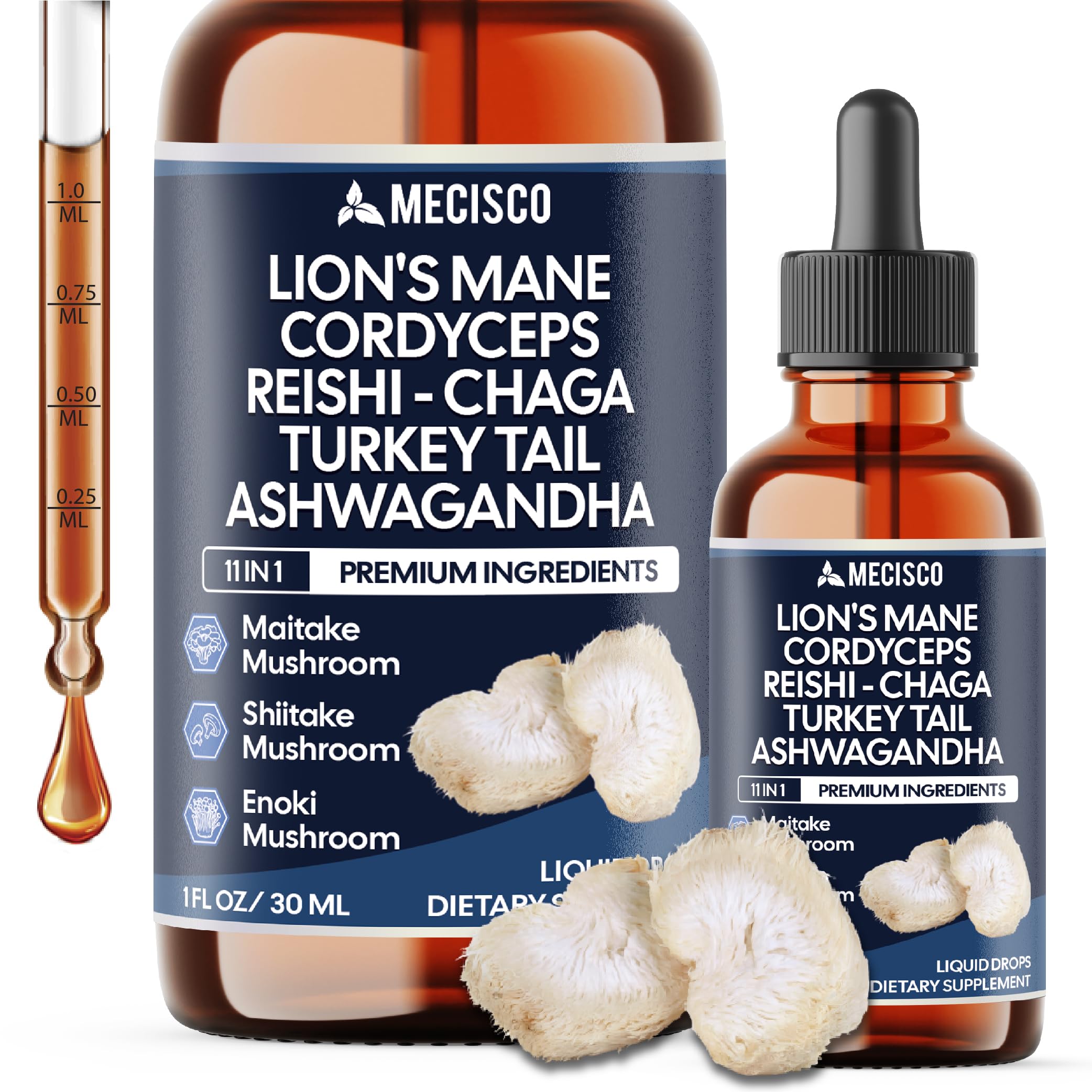 Mecisco 11in1 Mushroom Supplement Liquid Drops with Ashwagandha Lions Mane Turkey Tail Cordyceps Reishi Chaga Shitake Maitake Agaricus Oyster Mushrooms and Enoki Mushrooms - 1 FL Oz - 60 Day Supply