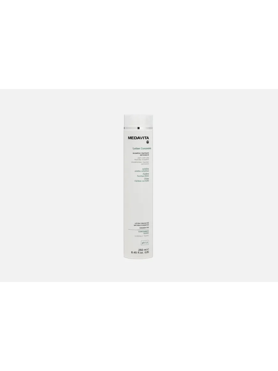 Объем шампуня составляет 250 мл, что делает его удобным для использования в домашних условиях. Для достижения максимального эффекта рекомендуется использовать его в комплексе с Lotion concentrée — интенсивным или тонизирующим лосьоном против выпадения волос от Medavita.