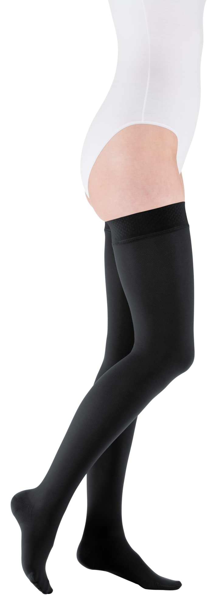medi mediven comfort Oberschenkellange Kompressionsstrümpfe mit Spitze Unisex Weit Besonders weiche Stützstrümpfe CCL2 mit Noppenhaftband für Damen und Herren Schwarz Größe IV