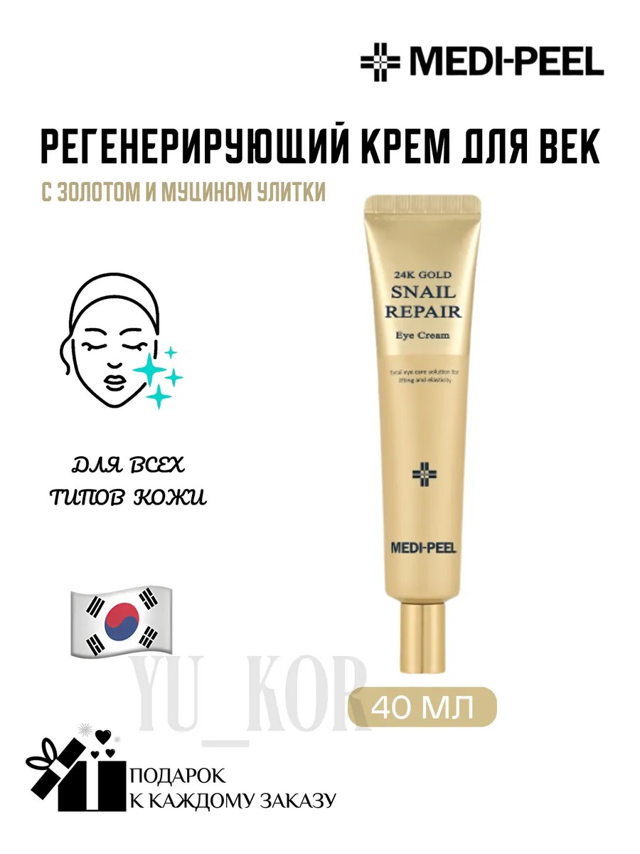 Medi-Peel 24K Gold Snail Repair Eye Cream, a regenerating eye cream with gold and snail mucin, effectively lightens dark circles under the eyes, improves tissue elasticity, and firms.