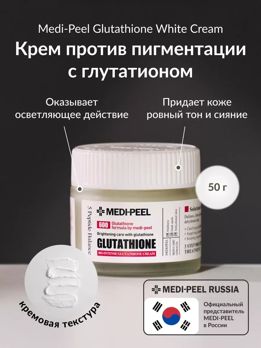 Крем для лица от пигментации Medi-Peel Bio-Intense Glutathione White Cream основан на мощном комплексе Glutathione, который состоит из пептида-глутатиона и экстракта облепихи. Этот комплекс обладает сильным антиоксидантным действием, способным осветлить пигментные пятна, предотвратить фотостарение и образование новых пигментационных пятен. В составе крема 2% ниацинамида, который помогает увлажнить кожу и защитить ее от эритемы, покраснений и раздражений, вызванных УФ-излучением. Ниацинамид обладает антиоксидантными свойствами, которые помогают предотвратить оксидативный стресс в клетках кожи и предупредить фотостарение. Крем medipeel осветляет пигментные пятна, предотвращает фотостарение, увлажняет кожу и укрепляет овал лица. Регулярное использование крема поможет достичь ровного и сияющего тонуса кожи.с 9 пептидов. Пептиды оказывают комплексное омолаживающее действие: повышают выработку коллаген, уменьшают глубину морщин, делают кожу плотной и упругой.
