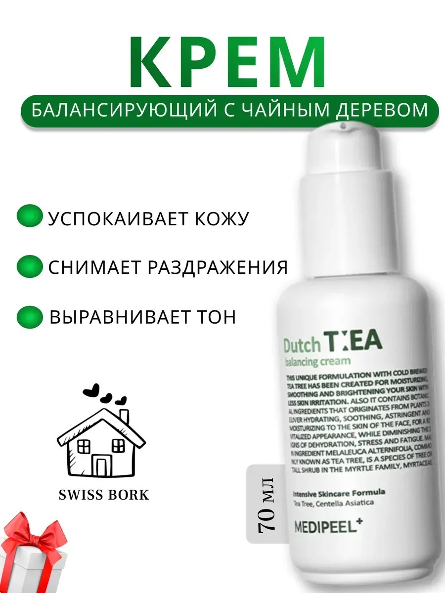 Medi-Peel Dutch Tea Balancing Cream with Tea Tree is a moisturizing face cream for sensitive skin. It soothes irritated skin, reduces redness, and has a light texture. It contains a triple complex of Australian tea tree, which has a calming effect on the skin. This complex has anti-inflammatory properties and helps relieve irritation, redness, and itching. It also contains a complex of Centella and its derivatives, which promotes skin restoration and strengthens its protective functions. The Centella complex helps improve skin elasticity, reduce the appearance of wrinkles, and refine skin texture. Panthenol, a powerful moisturizer, helps retain moisture in the skin, prevents dehydration, and makes the skin softer and smoother. Additionally, the cream contains 7 types of hyaluronic acid, one of the most effective ingredients for skin hydration. Hyaluronic acid penetrates deep into the skin, retains moisture, and improves firmness and elasticity, leaving it looking younger and more radiant. Ideal for daily use, this cream helps achieve maximum comfort and hydration for sensitive skin. Directions: After applying toner and serum, massage into your face and neck until fully absorbed.