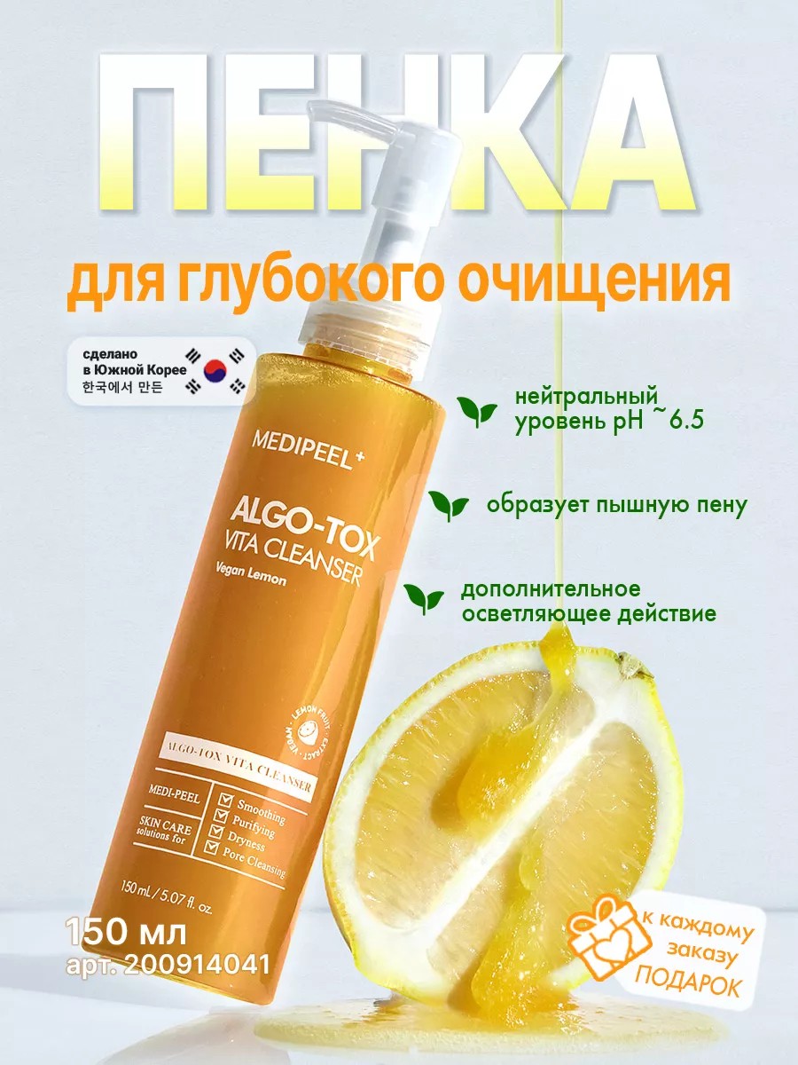 Гель для лица Medi-Peel Algo-Tox Vita Cleanser Vegan Lemon для глубокого очищения кожи с эффектом детокса растворяет все виды загрязнений, стойкую косметику и тональные средства, растворяет макияж и жировые пробки и очищает поры. Гель создан по уникальной кислородной формуле: при нанесении на кожу в контакте с кислородом гель, как и пенка для умывания, начинает создавать множество пузырьков, которые выталкивают все загрязнения наружу и смывают их.