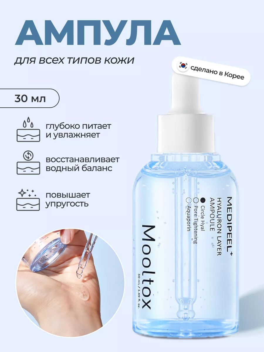 The innovative Korean hydrating facial serum Medi-Peel Hyaluronic Acid Layer Mooltox Ampoule 30ml is specially formulated to provide intense hydration and improve skin condition.