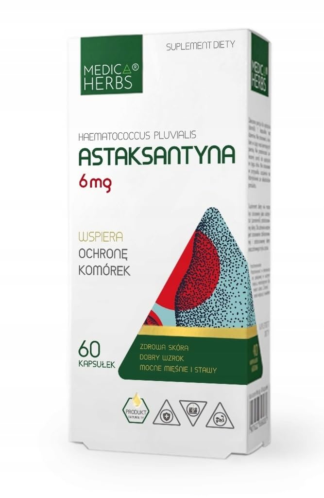 EIGENSCHAFTEN - Astaxanthin, das aus der Alge Haematococcus pluvialis gewonnen wird, unterstützt den korrekten Schutz der Zellen vor freien Radikalen und ungünstigen Umweltfaktoren. Es fördert die Hautelastizität und -feuchtigkeit sowie den Schutz der Haut bei Sonneneinstrahlung. Gebrauchsanweisung - 1 Kapsel einmal pro Tag. REINE FORMEL - Das Produkt enthält keine künstlichen Zusatzstoffe wie Konservierungsmittel, Farbstoffe, Aromen oder Füllstoffe. Der Farbton des Produkts kann aufgrund der Farbintensität des natürlichen Inhaltsstoffs variieren. QUALITÄT IN DER NATUR - Die verwendeten Kräuterextrakte werden auf den Gehalt an den für ihre gesundheitlichen Eigenschaften verantwortlichen Wirkstoffen bestimmt (qualitative und quantitative Analysen mit Hilfe von ultraviolettem Licht, Dünnschichtchromatographie (TLC), Hochleistungsflüssigkeitschromatographie (HPLC) und der Titrationsmethode). EFFEKTIVE FORMELN - Die ausgewählten pflanzlichen Standardisierungen entsprechen den aktuellen wissenschaftlichen Entwicklungen. Die festgelegte Konzentration des Wirkstoffs im Pflanzenextrakt ermöglicht es uns, Nahrungsergänzungsmittel mit spezifischen gesundheitlichen Wirkungen herzustellen. Durch die Standardisierung bringen wir die in der Natur verborgene, reproduzierbare Wirksamkeit zum Vorschein.