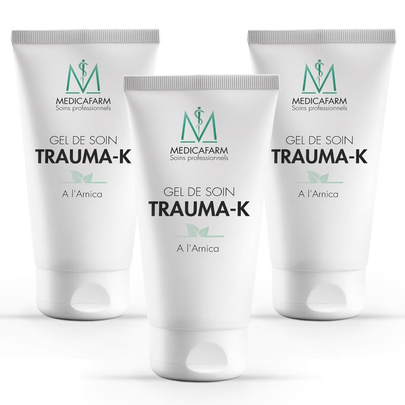 MEDICAFARM is a 100 French brand, with over 20 years of expertise in developing innovative, high-quality massage products to meet the needs of physiotherapists. DIRECTIONS FOR USE: Apply Trauma-K Care Gel directly to the affected area. Gently massage or wrap until absorbed. COMPOSITION: This gel is formulated with ingredients that respect the skin's pH and are allergen-free. It is non-staining and non-sticky. This gel comes in a 125ml tube. Practical and lightweight, it is easy to carry and store. DECONGESTANT: The cypress extract in Trauma-K Care Gel with Arnica helps to decongest and promote better circulation. ARNICA GEL: Trauma-K Care Gel has been developed to help facilitate the reduction of edema and hematomas, as well as to soothe muscle tension. Its formula includes naturally derived active ingredients such as Arnica, Cypress, Myrtle and Lavender essential oils.MEDICAFARM est une marque 100 Française, experte depuis plus de 20 ans dans l?élaboration de produits de massage innovants et de qualité répondant aux besoins des masseurs kinésithérapeutes. CONSEILS D'UTILISATION : Le Gel de soin Trauma-K est à appliquer directement sur la zone concernée. Faire pénétrer en léger massage ou en enveloppement. COMPOSITION : Ce gel est formulé à partir d'ingrédients respectant le PH cutané et sans allergène. Ne tâche pas, ne colle pas. Ce gel est conditionné sous forme de tube 125ml. Pratique et léger, il se transporte se range facilement. DÉCONGESTIONNANT : L'extrait de Cyprès contenu dans le gel de soin Trauma-K à l'Arnica contribue à décongestionner et favoriser un meilleur confort circulatoire. GEL À L'ARNICA : Le Gel de soin TRAUMA-K a été élaboré pour aider à faciliter la résorption des ?dèmes et hématomes ainsi qu'à apaiser les tensions musculaires. Sa formule inclus des ingrédients actifs d'origine naturelle tels que l'Arnica, Cyprès, Huiles essentielles de Myrte et de Lavande.MEDICAFARM - Gel de soin TRAUMA-K à l'arnica - Effet décongestionnant et apaisant - Sans paraben - Lot de 3 tubes de 125 ml