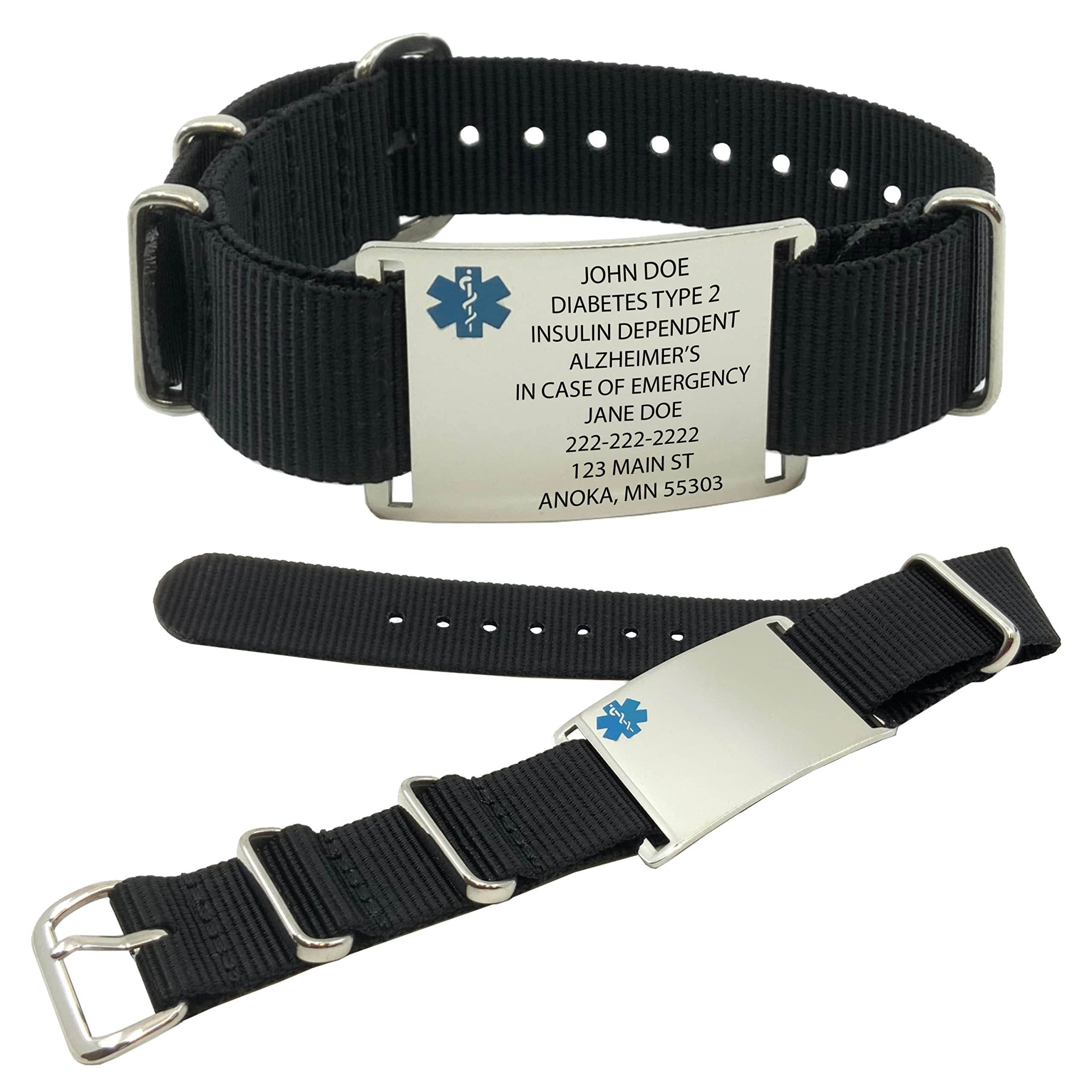 A medical alert wallet card with a protective sleeve is included with your purchase. Carrying a medical ID wallet card provides critical and actionable information for emergency responders. Additionally, should your medical information frequently change, you have access to our secure, free online Emergency Medical Card. It is designed with the same format and size as our printed medical alert cards and gives you unlimited editing, updating, and printing. The purpose of medical jewelry is to alert emergency responders with medical information about any conditions you may have or other concerns that may be relevant to your care in the event you become unconscious or otherwise incapacitated. This Medical Alert bracelet fits on wrist sizes 5.5 inches - 9.0 inches. The durable nylon wristband and 316L stainless steel medical id tag gives you a peace of mind that your medical information will be readily available in any emergency. Our medical alert ID bracelet comes with the medical "Star of Life" (SOL). This symbol is recognized worldwide, signifying to medical responders of existing medical conditions. The medical insignia is acid etched and color filled with a Blue "Star of Life.". Our medical ID bracelets for men and women come with a glossy finished medical alert ID plate with Blue "Star of Life" allowing for up to 18 lines of custom engraving front and back with high contrast black lettering to personalize your medical message.