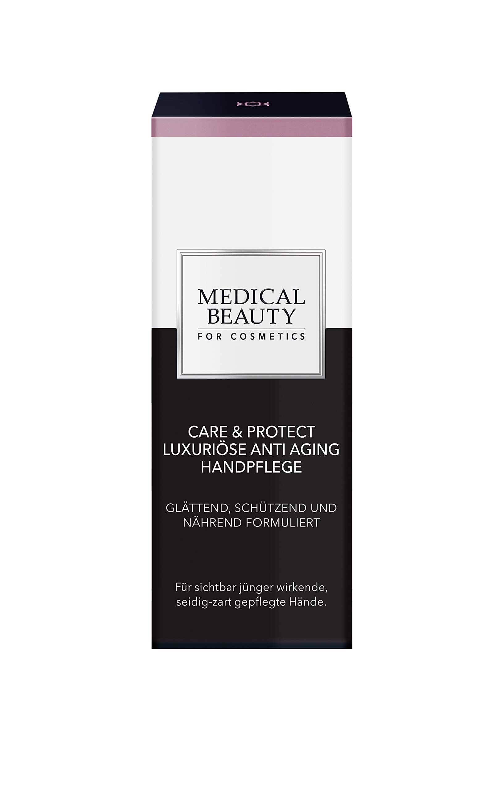 Medical Beauty for Cosmetics Care & Protect Luxurious Anti-Aging Hand Care Luxurious hand care cream for visible younger-looking, silky-tender hands. ✓ Extra -rich hand care Smooth, even hands are an essential feature for young people.But the skin on the hands in particular tends too early signs of aging.In order to keep a beautiful complexion or get it back, the hands regularly need attention in the form of rich, highly effective care. ✓ Perfect ""rejuvenation"" formula Medical Beauty for Cosmetics Care & Protect contains a multifunctional high-tech active ingredient, which helps reduce wrinkles in depth, counteract the development of pigment stains and prevent premature skin aging. ✓ Optimal care Hyaluronic acid, nourishing care substances and a film -forming active ingredient give the skin new elasticity, have a soothing effect and provide intensive moisture.The protective & nourishing formulation of luxurious hand care ensures noticeable smooth and smooth hands. Give the Medical Beauty for Cosmetics Care & Protect Luxurious Anti-Aging Hand care visible younger, silky-tender hands. Application: Apply a small amount to your hands several times a day as required.Massage your hand care well.The silky texture moves in quickly and does not stick. Care tip: Use the hand cream before the night's sleep to support the regeneration of the skin. Note: The product is skin -friendly and dermatologically tested.Free of parabens, formaldehyde scaffolding and mineral oils. Netto content: 50 milliliters Made in the EU ✓ Excellent care: hyaluronic acid, nourishing care substances and a film -forming active ingredient give the skin new elasticity, have a calming and protective and donations intensively moisture.✓ Beauty-Extra: Dry cuticles can also be noticeably reduced.✓ Reduce wrinkles: The smoothing, protective and nourishing hand care prevents premature skin aging, counteracts the development of pigment spots and helps to reduce wrinkles.✓ Medical Beauty for Cosmetics Care & Protect Luxurious Anti-aging Hand care is an extra-rich hand cream for visibly younger-looking, silky-tender hands. MEDICAL BEAUTY FOR COSMETICS CARE & PROTECT LUXURIÖSE ANTI-AGING HANDPFLEGE Luxuriöse Handpflege Creme für sichtbar jünger wirkende, seidig-zart gepflegte Hände. ✓ Extrareichhaltige Handpflege Glatte, ebenmäßige Hände sind ein wesentliches Merkmal für jugendliches Aussehen. Doch gerade die Haut an den Händen neigt zu frühen Anzeichen von Alterung. Um sich ein schönes Hautbild zu bewahren oder dieses zurückzuerlangen, benötigen die Hände regelmäßig Aufmerksamkeit in Form von reichhaltiger, hocheffektiver Pflege. ✓ Perfekte „Verjüngungs“-Formel MEDICAL BEAUTY for Cosmetics Care & Protect enthält einen multifunktionalen Hightech-Wirkstoff, der hilft Falten in der Tiefe zu verringern, der Entstehung von Pigmentflecken entgegenzuwirken und vorzeitiger Hautalterung vorzubeugen. ✓ Optimale Pflege Hyaluronsäure, nährende Pflegesubstanzen und ein filmbildender Wirkstoff verleihen der Haut neue Elastizität, wirken beruhigend und spenden intensiv Feuchtigkeit. Die schützende & nährende Formulierung der luxuriösen Handpflege sorgt für spürbare glattere und geschmeidige Hände. Verleihen Sie mit der MEDICAL BEAUTY for Cosmetics Care & Protect Luxuriöse Anti-Aging Handpflege sichtbar jünger wirkende, seidig-zart gepflegte Hände. Anwendung: Tragen Sie je nach Bedarf mehrmals täglich eine kleine Menge auf die Hände auf. Massieren Sie die Handpflege gut ein. Die seidige Textur zieht rasch ein und klebt nicht. Pflegetipp: Verwenden Sie die Handcreme vor der Nachtruhe, um die Regeneration der Haut zu unterstützen. Hinweis: Das Produkt ist hautverträglich und dermatologisch getestet. Frei von Parabenen, Formaldehydabspaltern und Mineralölen. Nettogehalt: 50 Milliliter Hergestellt in der EU✓ EXZELLENTE PFLEGE: Hyaluronsäure, nährende Pflegesubstanzen und ein filmbildender Wirkstoff verleihen der Haut neue Elastizität, wirken beruhigend sowie schützend und spenden intensiv Feuchtigkeit. ✓ BEAUTY-EXTRA: Auch trockene Nagelhaut kann spürbar reduziert werden. ✓ FALTEN REDUZIEREN: Die glättende, schützende und nährend formulierte Handpflege beugt vorzeitiger Hautalterung vor, wirkt der Entstehung von Pigmentflecken entgegen und hilft, Falten zu reduzieren. ✓ MEDICAL BEAUTY FOR COSMETICS Care & Protect Luxuriöse Anti-Aging Handpflege ist eine extrareichhaltige Handcreme für sichtbar jünger wirkende, seidig-zart gepflegte Hände.MEDICAL BEAUTY® Care & Protect Anti-Aging Handpflege | Für jünger wirkende, gepflegte Hände | Inhalt: 50 ml