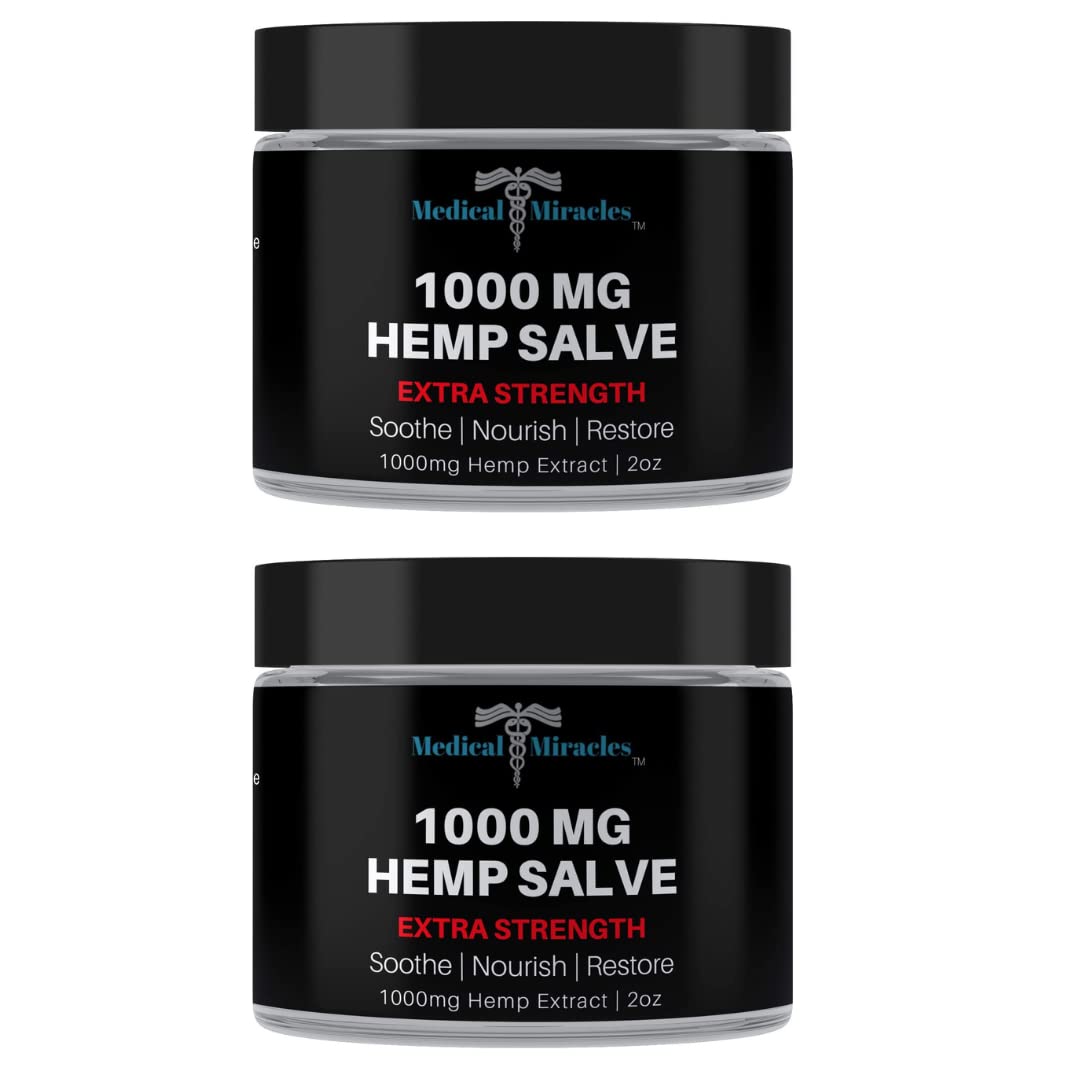 Introducing our 1000mg Hemp Salve, a natural and soothing solution for your wellness needs. Crafted with care, this premium salve harnesses the power of hemp-derived ingredients to provide you with a nourishing topical experience. Each jar of our Hemp Salve contains 1000mg of hemp, carefully selected for its high-quality composition. We've combined this hemp with a proprietary blend of nourishing botanicals to create a luxurious, non-greasy salve that is perfect for daily use. This hemp-infused salve is designed to promote a sense of relaxation and comfort when applied to the skin. Its rich, creamy texture glides on smoothly, leaving your skin feeling hydrated and refreshed. You can apply it to targeted areas of your body, such as joints or muscles, for a calming massage or as part of your skincare routine. Our 1000mg Hemp Salve is free from harsh chemicals and artificial additives, ensuring that you can feel good about using it on your skin. Whether you're seeking relief after a long day or looking to enhance your skincare regimen, our hemp salve offers a natural and nourishing solution. Please note that our product does not make any specific claims. We are committed to providing you with a premium hemp-infused salve that you can trust for your daily self-care needs. Experience the soothing properties of hemp with our 1000mg Hemp Salve and pamper your skin with nature's finest ingredients.APPLYING HEMP TOPICALLY is one of the fastest growing ways of using Hemp. Topical application of Hemp allows for the Hemp compounds to be absorbed directly into the affected area. MOISTURIZES FOR HEALTHY, BEAUTIFUL, RADIANT SKIN: Our proprietary formula contains Omegas 3, 6, and 9 to keep your skin feeling soft, moist and refreshed. Experience the satisfaction, respite and happiness that come with the salve, plus the addition of elegant, glowing skin. CUSTOMER PROVEN RESULTS: Topically applied hemp is formulated to interact with receptors that you can feel. Due to the unique properties, our thousands of satisfied customers have reported multiple benefits, such as increased energy, stamina, and a steady return to an active lifestyle. LONG-LASTING SALVE PROVIDES HOURS OF COMFORT: Our high-quality hemp infused remedy contains a large, 1000mg dose of hemp oil. Our superior product line is made from the best non-GMO, preservative free, and powerful sources. AMERICAN MADE, ESSENTIAL FOR HEALTH, PLANT BASED: Not All Hemp Balms Are Created Equal — Pay for True Quality You Will Not Be Disappointed. Medical Miracles is a pioneer in the introduction of topical relief oils, ointments, lotions, and gels created from pure, natural ingredients. All of our products are US made, grown right here in Colorado, and pass our rigorous testing procedures to ensure each batch meets our standards of consistent quality, safety, and potent benefits.