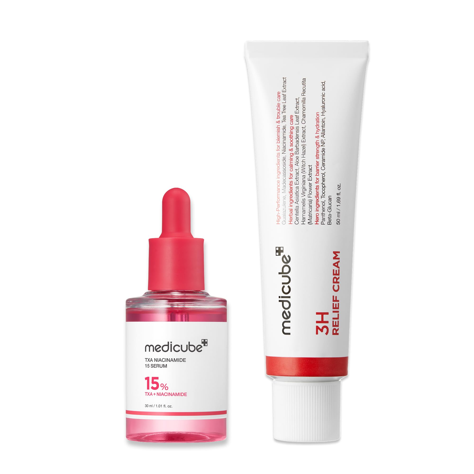 [Exclusive medicube Ingredient Blend] Powered by a unique combination of 5 Tranexamic, 10 Niacinamide, and 2 Arbutin, this serum deeply hydrates, refines skin texture, and leave your skin visibly healthier. [All-in-One Glow Serum] Uneven skin tone, hydration, and skin texture care with 10-layer hyaluronic acid, Panthenol, and Betaine. [Powered by Calming Ingredients] Guaiazulene and Madecassoside help soothe and provide comforting care for stressed skin. [Everyday Comfort Moisturizer] Daily relief cream designed to help calm, deliver lasting hydration, and support a healthy-looking skin barrier — for balanced, comfortable skin day and night. [Comforting Serum Cream Duo] Soothing skincare duo ideal for after spot care to help refine uneven-looking tone while calming and rebalancing stressed skin.