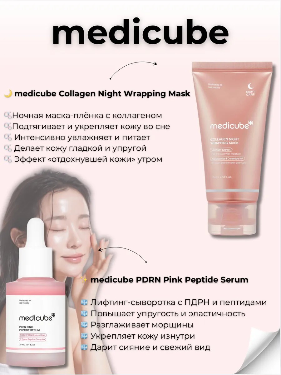 | Комплектация | Лифтинг-сыворотка с ПДРН и пептидами medicube PDRN Pink Peptide Serum Ночная маска-плёнка с коллагеном medicube Collagen Night Wrapping Mask |