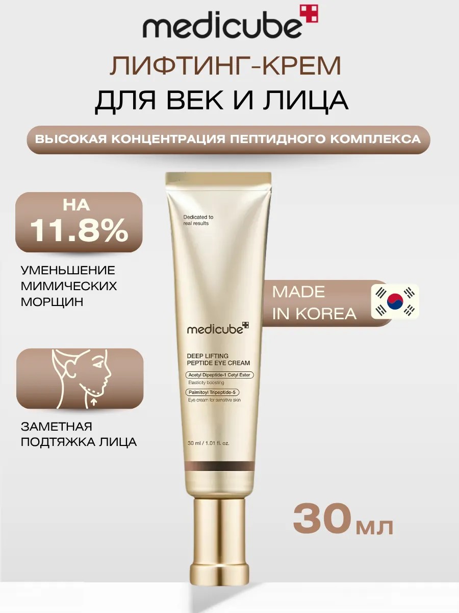 Омолаживающий крем Medicube Deep Lifting Peptide Eye Cream For Face создан для ухода за кожей лица и области вокруг глаз. Формула с комплексом из 7 видов коллагена, 4 пептидов и 7 видов гиалуроновой кислоты помогает добиться лифтинг-эффекта, увлажняет сухую кожу, способствует уменьшению морщин под глазами. Ниацинамид в составе осветляет пигментные пятна и темные круги, сужает поры, придаёт коже свежий отдохнувший вид. Эффективно работает против мешков и синяков под глазами. Подходит также для шеи и зоны декольте. Продукт можно наносить на всё лицо и под глаза, а также точечно на морщин. Крем борется с признаками старения, сохраняя красоту и свежесть лица. Он мягко ухаживает за чувствительной зоной под глазами, устраняя следы усталости. Прекрасный выбор как подарок. Благодаря своим anti age свойствам, станет прекрасным подарком женщине. Отлично подходит для сухой и чувствительной кожи, а также для возрастной кожи 60 +.
