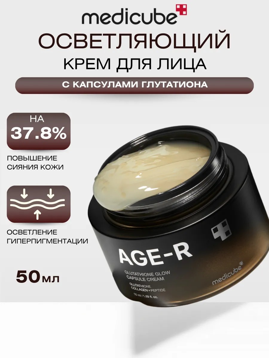 Крем гель для лица с капсулами глутатиона Medicube AGE-R Glutathione Glow Capsule обеспечивает глубокое увлажнение и осветление даже застойной пигментации и веснушек. Гелевая текстура комфортно распределяется даже по жирной коже, не оставляя липкости и пленки. Капсулы с содержанием глутатиона 0.1% проникают глубоко в кожу, точечно находят темные пятна и осветляют их. Глутатион также работает как мощный антиоксидант, защищает кожу от фотостарения. Ниацинамид также способствует осветлению пигментации, выравниванию тона кожи и борьбе с постакне. Он также снимает покраснения и раздражения, работает на сужение пор, помогает снизить жирный блеск, придаёт коже красивое естественное сияние. Растворимый коллаген в составе защищает от дряблости, укрепляет кожу, сохраняет в ней влагу. Церамиды укрепляют барьер кожи и предотвращает потерю влаги, что делает применение комфортным для сухой и чувствительной кожи. Продукт также обладает антивозрастными свойствами благодаря содержанию комплекса пептидов. Он эффективно борется с мелкими морщинами, повышает упругость и эластичность кожи, способствует общему омоложению кожи. Легкая консистенция позволяет использовать средство вокруг глаз без риска раздражений. Этот корейский уходовый продукт станет отличным подарком для женщин, ценящих качественную косметику. Отличное решение для зрелой кожи с возрастными изменениями. Подходит как для ежедневного использования утром и вечером, так и для локального нанесения на проблемные зоны. Позвольте своей коже засиять здоровьем!