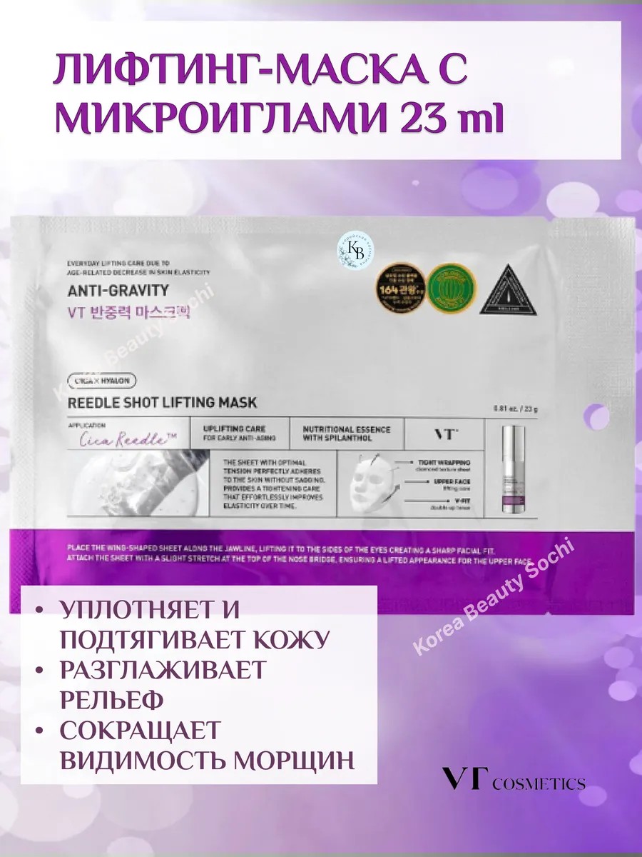 Лифтинг-маска с микроиглами 23 ml VT Cosmetics Reedle Shot Lifting Mask уплотняет и подтягивает кожу, разглаживает рельеф и сокращает видимость морщин, улучшая состояние кожи с возрастными изменениями.
