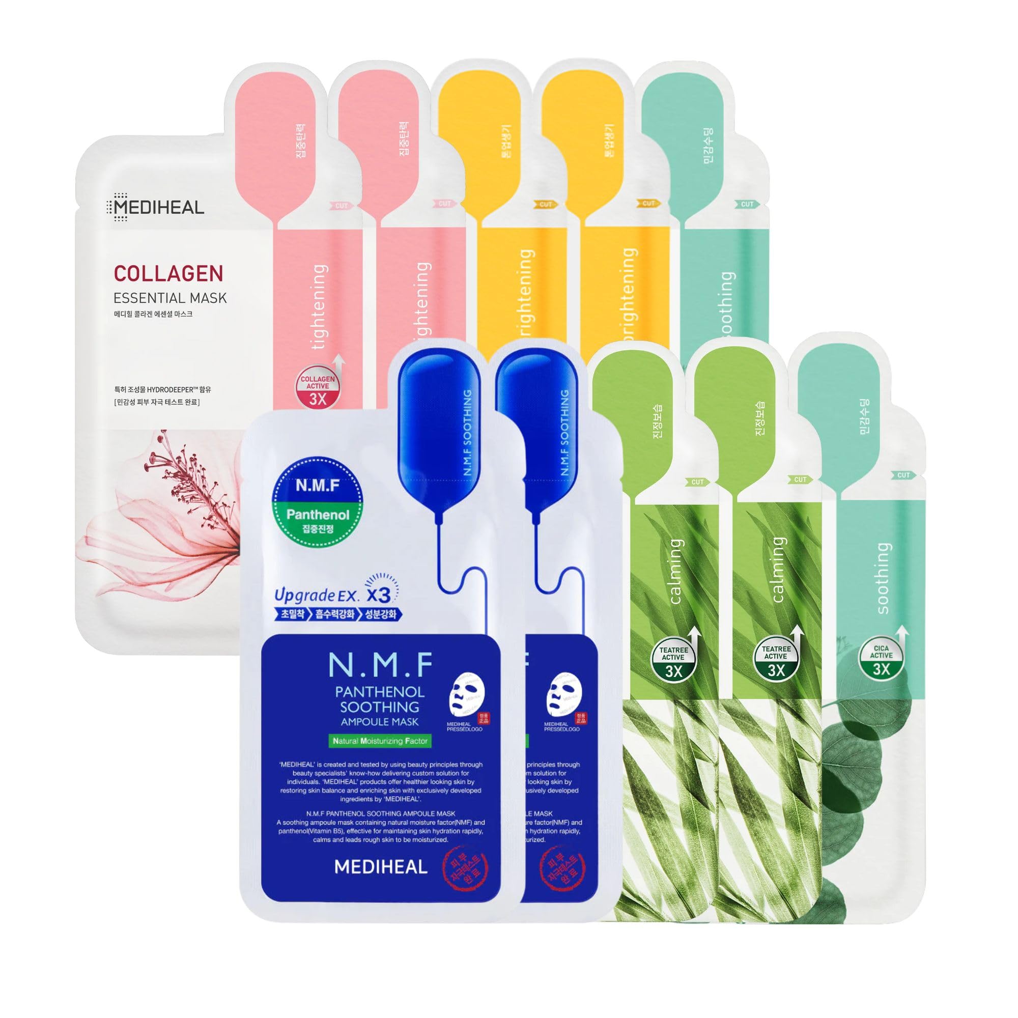 Discover the Mediheal facial mask set with 10 cloth masks in 5 types (2 pieces each) - directly from Korea. Each mask is formulated with highly effective active ingredients to specifically care for different skin needs: luminous, soothing, moisturizing, firming or regenerating. The ultra-soft cloth masks adapt perfectly to the skin and optimally release the active ingredients. Ideal as a daily care treatment or as an intensive skin boost – for a visibly fresher, smoother and healthier complexion. SAFETY WARNING For external use only. Avoid contact with the eyes. Keep away from open flames or heat sources.The collagen mask intensively hydrates, improves skin elasticity and provides a smoother, firmer complexion, perfect for mature or dry skin. With N.M.F moisture complex and mild retinol, this mask helps refine pores, smooth fine lines and leave skin radiant and hydrated. Enriched with Madecassoside from Centella Asiatica, it supports skin regeneration, strengthens the protective barrier and soothes sensitive or irritated skin. With tea tree extract and Lactobacillus, this mask soothes irritated, oily or acne-prone skin. It helps reduce redness and brighten the skin tone. Vita Essential Mask: radiant complexion and moisture. The Vita mask is rich in vitamin complexes, which lighten dull skin and strengthen the moisture barrier. Ideal for tired, dull skin that needs an instant boost of freshness.Mediheal Vita, Tea Tree, Madecassoside, Collageen N.M.F retinol, vochtinbrengende, rustgevende en verstevigende doekmaskers uit Korea, 10 stuks, 5 soorten van elk 2 stuks Ontdek de Mediheal gezichtsmaskerset met 10 doekmaskers in 5 soorten (elk 2 stuks) – rechtstreeks uit Korea. Elk masker is geformuleerd met zeer effectieve actieve stoffen om specifiek verschillende huidbehoeften te verzorgen: lichtgevend, kalmerend, hydraterend, verstevigend of regenererend. De ultrazachte doekmaskers passen zich perfect aan de huid aan en geven de werkzame stoffen optimaal af. Ideaal als dagelijkse verzorgingskuur of als intensieve huidboost – voor een zichtbaar frissere, gladdere en gezondere teint. VEILIGHEIDSWAARSCHUWING Alleen voor uitwendig gebruik. Vermijd contact met de ogen. Uit de buurt houden van open vuur of warmtebronnen.Het collageenmasker hydrateert intensief, verbetert de huidelasticiteit en zorgt voor een gladdere, stevigere teint, perfect voor een rijpere of droge huid. Met N.M.F-vochtcomplex en mild retinol helpt dit masker poriën te verfijnen, fijne lijntjes glad te maken en de huid stralend en gehydrateerd achter te laten. Verrijkt met Madecassoside uit Centella Asiatica, ondersteunt het de huidregeneratie, versterkt de beschermende barrière en kalmeert gevoelige of geïrriteerde huid. Met theeboomextract en Lactobacillus kalmeert dit masker geïrriteerde, olieachtige of acnegevoelige huid. Het helpt roodheid te verminderen en het huidbeeld te verhelderen. Vita Essential Mask: stralende teint en vochtigheid. Het Vita-masker is rijk aan vitaminecomplexen, die doffe huid lichter maken en de vochtbarrière versterken. Ideaal voor vermoeide, doffe huid die direct een frisheidskick nodig heeft.