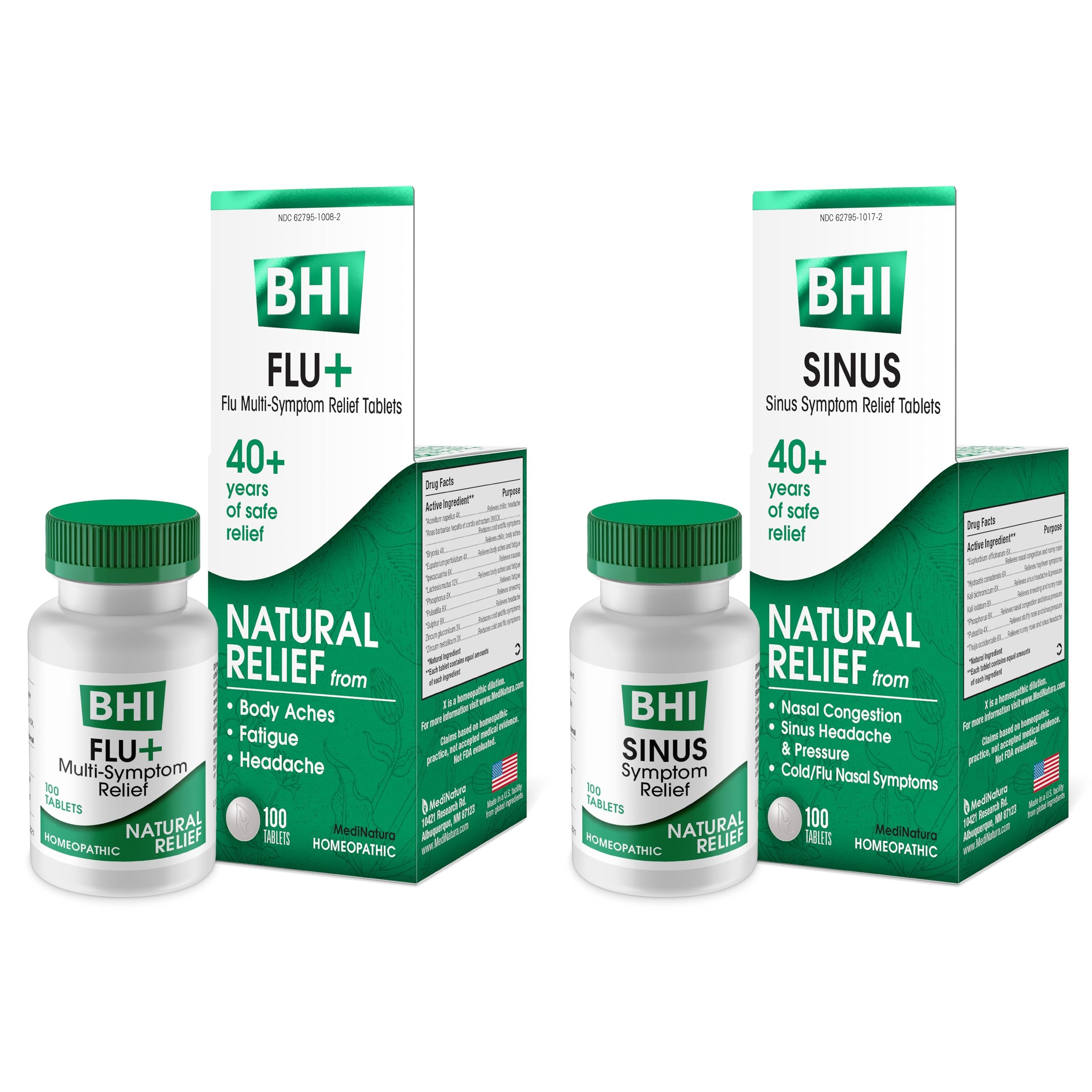 MediNatura BHI Cold, Flu, and Sinus Relief Bundle BHI Cold +Flu Multi-Symptom Relief Tablets (100) + BHI Sinus Natural Congestion Relief Tablets (100)