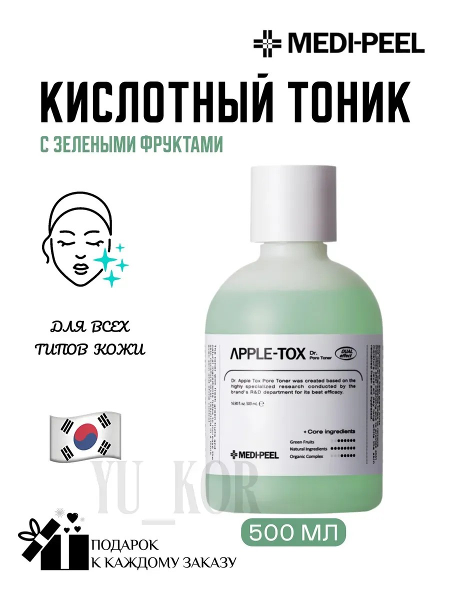 Кислотный тоник с зелеными фруктами для жирной кожи Medi-Peel Dr.Apple-Tox Pore Toner контролирует работу сальных желез, снижает жирность кожи и препятствует появлению жирного блеска. Помогает в борьбе с акне и воспалениями, мягко отшелушивает ороговевший слой, не допуская закупорки пор.