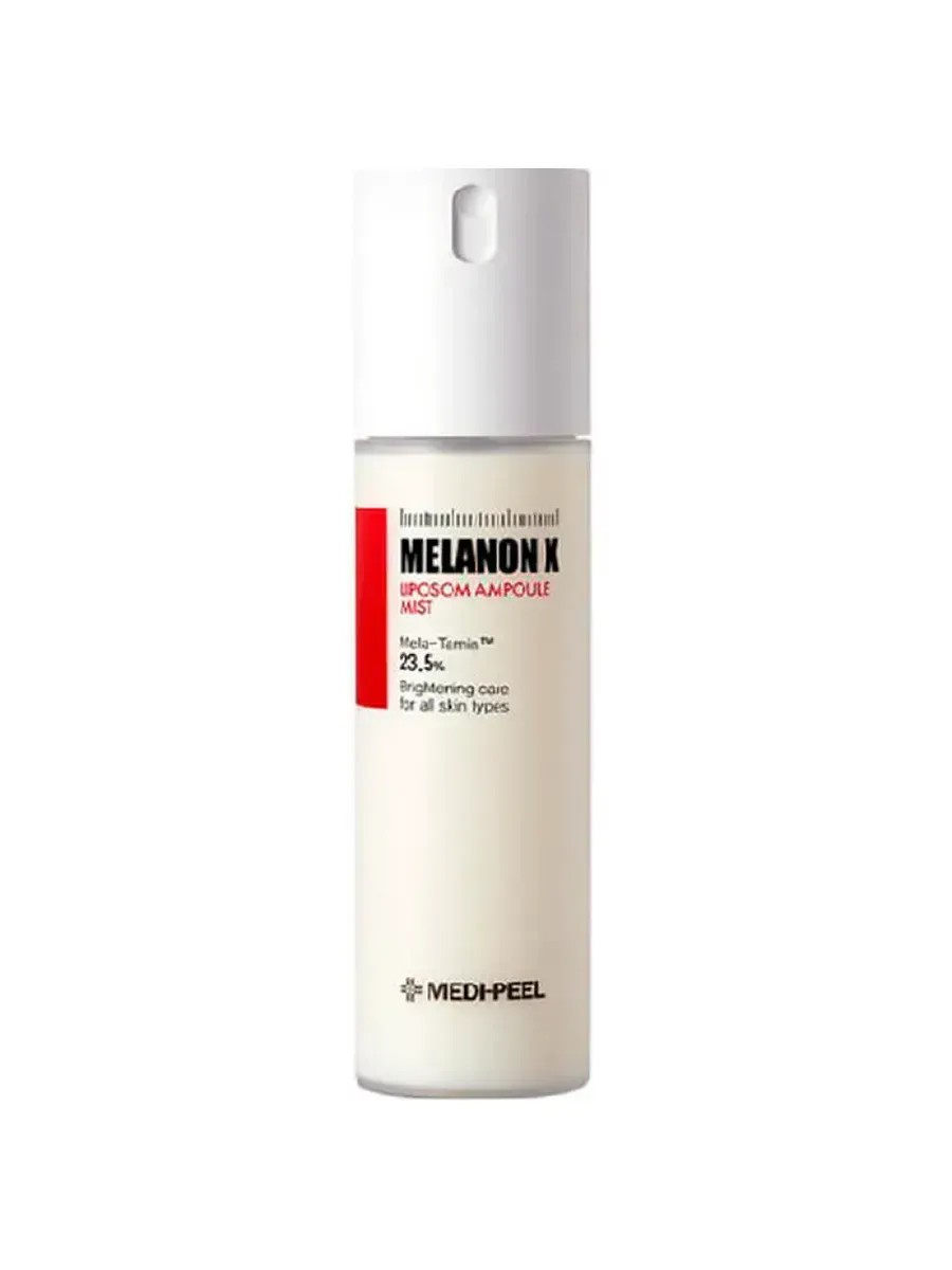 Ампульный тонер-мист Medi-Peel Melanon X Liposome Ampoule Mist борется с пигментацией и морщинами, моментально освежая и увлажняя кожу. Средство обеспечивает антивозрастное действие и улучшает общий тон, придавая здоровое сияние и гладкий рельеф. Продукт разглаживает, уменьшает глубину морщин, осветляет пигментные пятна и веснушки, устраняя тусклость и улучшая тургор. Мист равномерно распыляется, отлично подходит для подготовки кожи к макияжу. Продукт легко и быстро использовать в качестве тонера и сыворотки, удобно поддерживать оптимальный уровень увлажнённости в любое время. Липосомальная технология доставки стабилизирует и транспортирует активы глубоко в эпидермис, за счёт чего они работают в глубоких слоях кожи, оказывают более быстрый и мощный эффект. Основные действующие компоненты: Транексамовая кислота — осветляющий актив, подавляет активность тирозиназы — фермента, который запускает выработку пигмента меланина. Не вызывает фоточувствительности, может использоваться в дневном уходе. Глутатион стимулирует восстановление, заживляет микроповреждения, замедляет возрастные изменения, борется с покраснением и отбеливает. Подходит для всех типов кожи. Способ применения: встряхните, распылите на расстоянии 20 сантиметров от лица, лёгкими похлопывающими движениями пальцев помогите средству впитаться. Можно использовать как до, так и после нанесения макияжа.