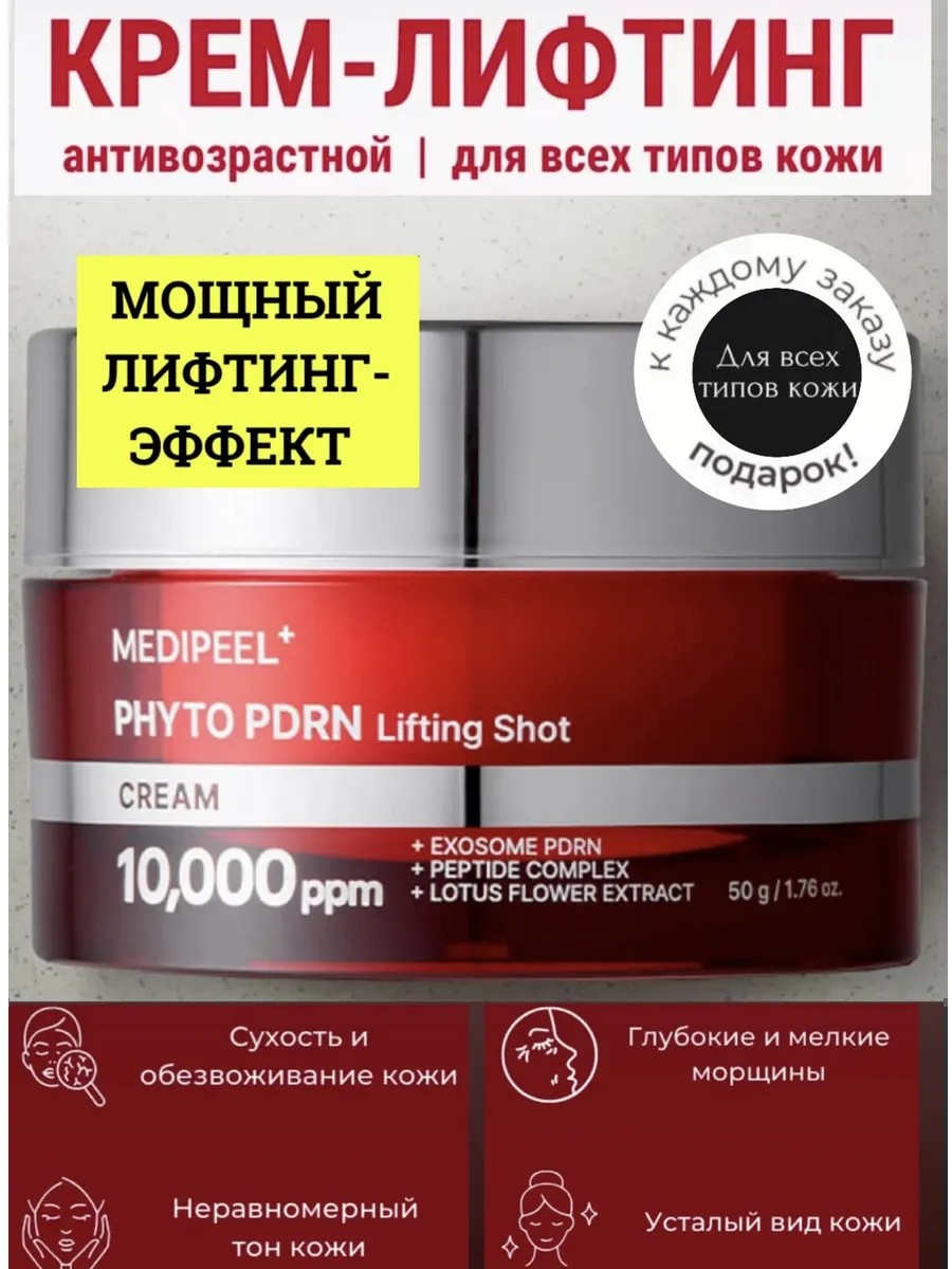 Medi-Peel Phyto Exosome PDRN Lifting Shot Cream 50g — это антивозрастной крем, направленный на восстановление, увлажнение и подтяжку кожи. Он сочетает в себе инновационные компоненты для глубокого ухода и омоложения. Какие проблемы решает: Сухость и шелушение кожи; Утрата эластичности и упругости; Глубокие морщины и мелкие линии; Неравномерный тон и текстура кожи; Первые признаки старения и увядания кожи; Потеря естественного сияния кожи На что направлен крем? Лифтинг и упругость: Крем корея помогает подтянуть контур лица и повысить эластичность кожи за счет комплекса экзосом, пептидов и полинуклеотидов (PDRN). Антивозрастной эффект: Разглаживает мелкие морщины и уменьшает выраженность глубоких. Стимулирует регенерацию кожи и улучшает текстуру. Интенсивное увлажнение: Удерживает влагу в коже благодаря гиалуроновой кислоте и компоненту AQUAXYL. Защита кожи: Укрепляет кожный барьер, защищая от воздействия внешних факторов и замедляя процессы старения. Возраст: Рекомендуется для возрастной категории 25+, особенно для тех, кто хочет предотвратить или минимизировать признаки старения. Подходит как для начальных, так и для более выраженных возрастных изменений. Тип кожи: Для всех типов кожи, включая сухую, нормальную, комбинированную и чувствительную. Особенно полезен для кожи, склонной к сухости, обезвоживанию и потере упругости. Ключевые компоненты: Фитоэкзосомы яблока: Ускоряют регенерацию клеток, улучшая текстуру кожи. PDRN из лотоса: Стимулируют выработку коллагена, усиливают процесс восстановления кожи. Комплекс из 12 пептидов: Укрепляют структуру кожи, восстанавливая ее плотность. Гиалуроновая кислота и AQUAXYL: Обеспечивают интенсивное увлажнение, предотвращая потерю влаги. Этот крем станет отличным выбором для тех, кто ищет средство с антивозрастным и восстанавливающим действием!