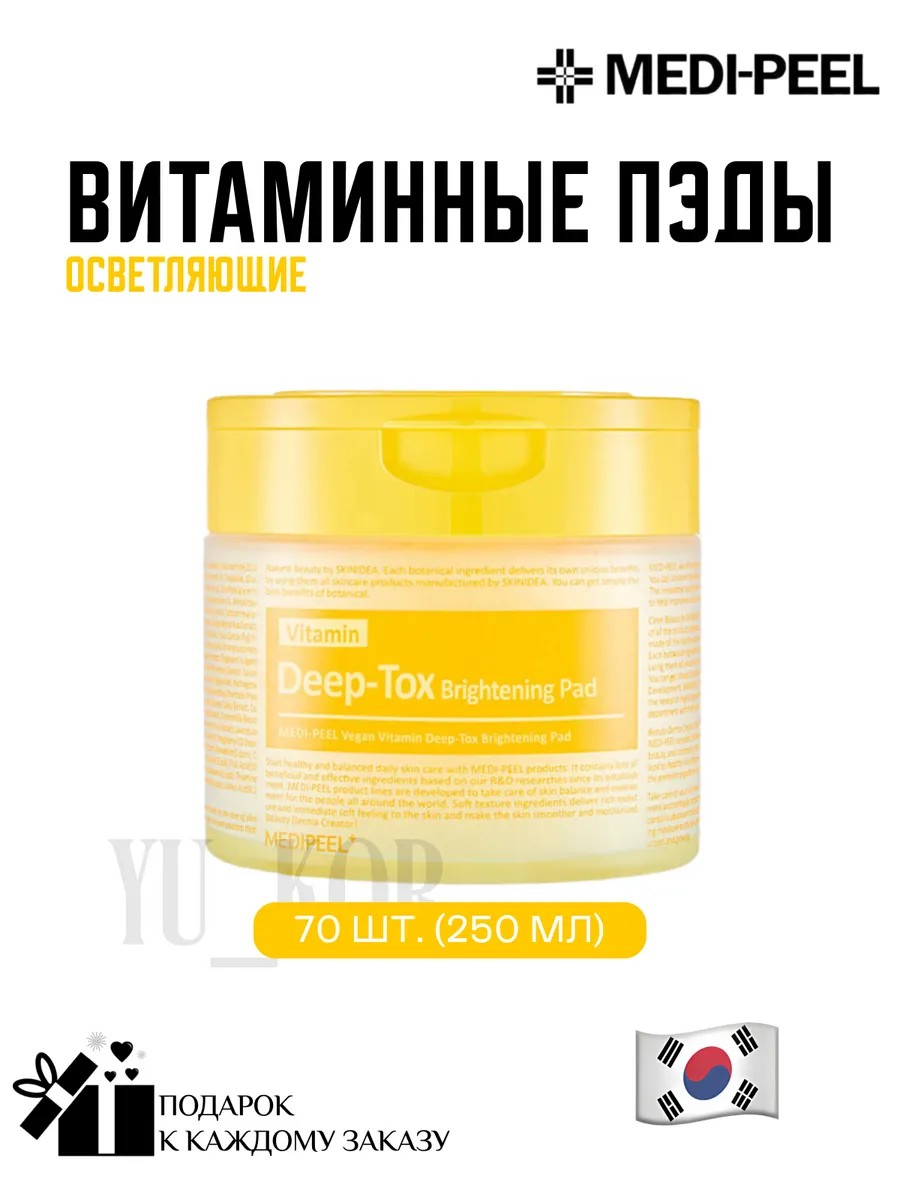 Осветляющие витаминные пэды для лица Medi-Peel Vitamin Deep-Tox Brightening Pad осветляют, мягко отшелушивают кожу и устраняют тусклость, выравнивая тон и придавая здоровое сияние. Уровень pH 5.3.