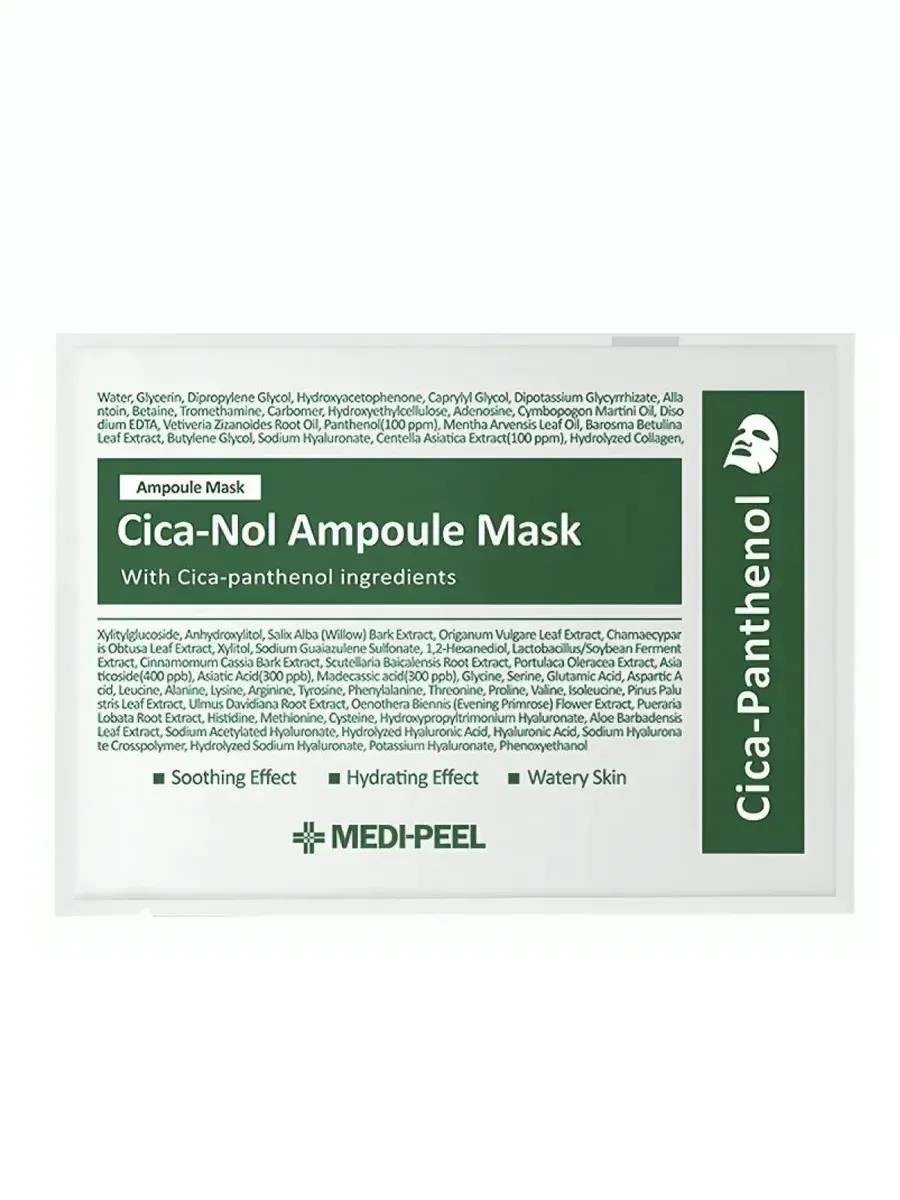 Успокаивающая маска с центеллой и пантенолом Medi-Peel Cica-Nol Ampoule Mask увлажняет и смягчает кожу, снимает покраснение и раздражение, избавляет от стянутости и дарит приятное чувство комфорта. Ускоряет заживление повреждённых шелушащихся участков. Препятствует чрезмерной выработке себума и появлению жирного блеска. Содержит комплекс Cica-Nol, состоящий из центеллы и пантенола, а также компонент Aquaxyl, аминокислоты, коллаген, гиалуроновую кислоту, комплексы Anti Sebum P и Natural Protector.