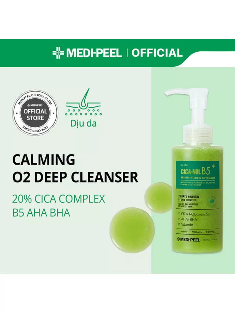Medi-Peel Phyto Cica-Nol B5 AHA BHA Vitamin Calming O2 Deep Cleanser penetrates deep into pores, removing all types of impurities, regular and long-lasting makeup, foundation, and sunscreen.