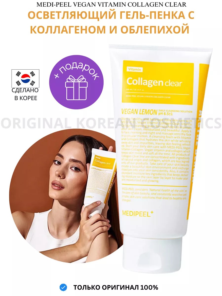 Vegan Vitamin Collagen Clear brightening gel-foam cleanses pores, removes impurities and excess sebum, washes away makeup residue, evens skin tone, and reduces the appearance of pigmentation, leaving you feeling fresh and hydrated.