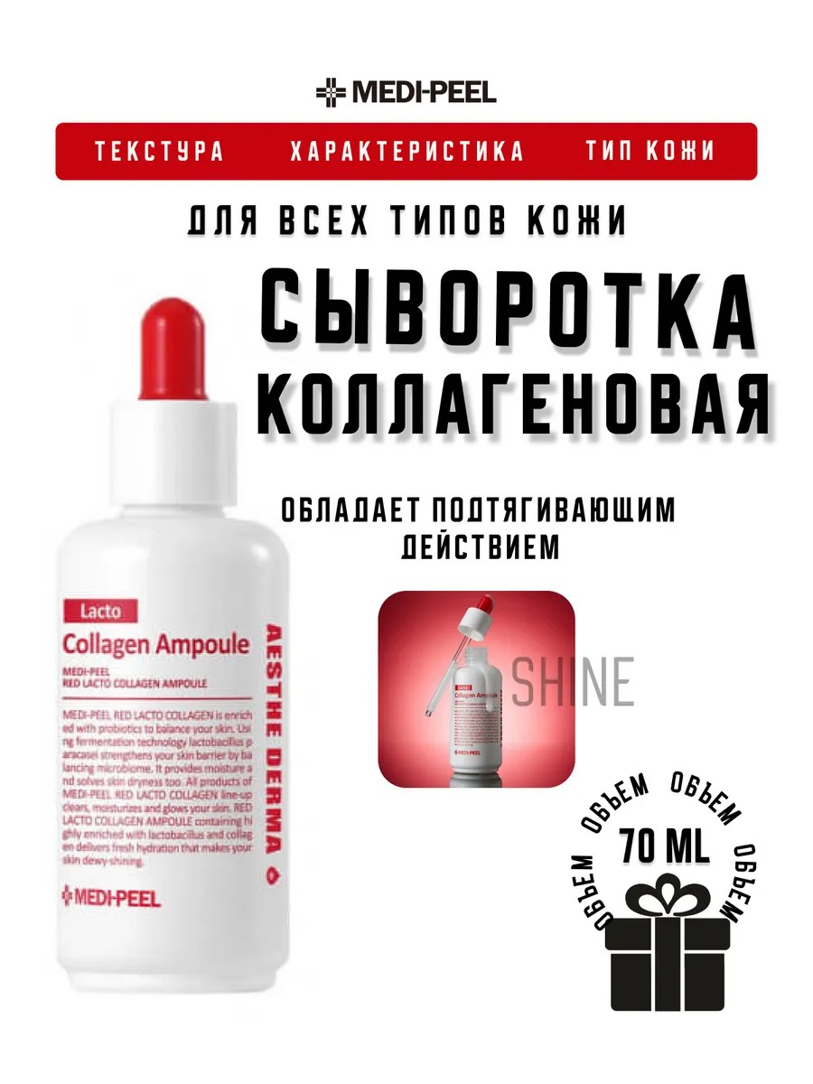 Medi-Peel Red Lacto Collagen Ampoule, a collagen ampoule with lactobacilli and amino acids, makes the skin denser and stronger, smoothes the microrelief, and restores firmness and elasticity.