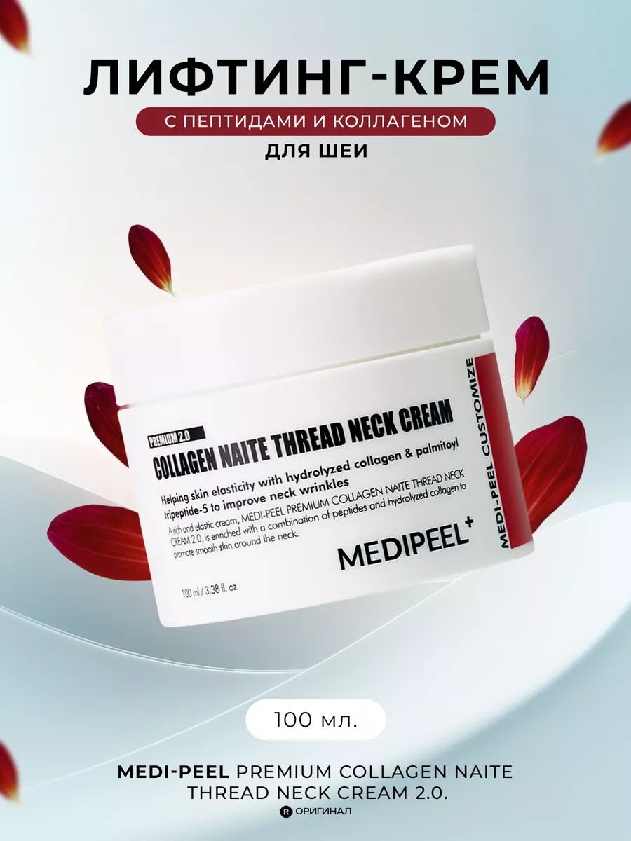 Уникальный крем для шеи и декольте Medi-Peel Naite Thread Neck Cream разработан специально для уплотнения и подтяжки кожи в области шеи и декольте. Крем обладает выраженным лифтинг-эффектом, который помогает бороться с кольцами Венеры и придает коже более упругий и подтянутый вид. В составе крема присутствует комплекс из 5 видов пептидов, который стимулирует процессы регенерации кожи, укрепляет ее структуру и повышает ее упругость. Гидролизованный коллаген увлажняет и питает кожу, способствуя ее уплотнению и придавая ей более молодой и сияющий вид. Масло сладкого миндаля обладает увлажняющими свойствами и помогает смягчить и сделать кожу более гладкой. Ниацинамид, или витамин В3, способствует улучшению текстуры кожи, выравнивает тон и уменьшает пигментацию, помогает укрепить естественный барьер кожи и снизить потерю влаги. Крем для шеи и декольте обеспечивает интенсивное питание, уплотнение и подтяжку кожи. Ваша кожа станет более упругой, молодой и сияющей. Применение: Нанесите необходимое количество крема на чистую сухую кожу шеи. Мягко помассируйте кожу, двигаясь снизу вверх, до полного впитывания крема Purified water, glycerin, sweet almond oil, hydrolyzed collagen, cetearyl alcohol, cetylethylhexanoate, 1,2-hexanediol, chamomile flower extract, cyclopentasiloxane, cyclohexasiloxane, propylenegly Cole, glyceryl stearate, olive oil, polysorbate 60, dimethicone, beeswax, sodium polyacrylate, PEG-100 stearate, palmitic acid, stearic acid, hydrogenated lecithin, butylene glyceride Cole, Carbomer, Arginine, Ethylhexyl Glycerin, Hydrolyzed Elastin, Fragrance, Adenosine, Phenoxyethanol, Disodium IDTA, Panthenol, Ceramide 3, Chopiberry Extract, Usnia Extract, Pasqueflower Extract, Die Propylene Glycol, Aloe Vera Leaf Juice, Caprylyl Glycol, Glyceres-20, Lavender Extract, PEG-10 Lepe Seed Sterol, Green Tea Extract, Dipeptide Diaminobutyroyl Benzylamide Diacetate, Palmitoyl Tripeptide -5, Centella asiatica extract, potassium sorbate, sodium benzoate