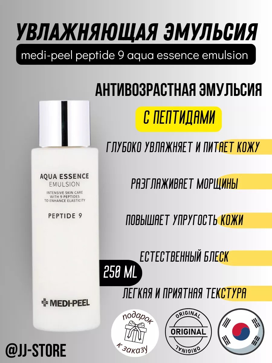 Представляем бестселлер корейского ухода за кожей – Medi Peel Peptide 9 Aqua Essence эмульсия. Эта эмульсия для лица — новый лучший друг вашей кожи, когда дело касается восстановления красоты и здоровья. Благодаря уникальной формуле, содержащей 9 пептидов, 4 типа гиалуроновой кислоты, гидролизованный коллаген и эластин, бетаин, аргинин, аденозин, комплекс растительных экстрактов и кетон малины, этот тоник обеспечивает мощное питание и увлажнение вашей кожи. Он активирует процессы клеточного омоложения и восстановления, укрепляя основную структуру кожи, в результате чего цвет лица становится более упругим и эластичным. Регулярное использование этой эмульсии вдохнет новую жизнь в вашу кожу, сделав ее свежей, мягкой, сияющей и молодой. Повышает естественный иммунитет вашей кожи, стирая следы усталости и стресса. Специально разработанная формула с пептидами и комплексом гиалуроновой кислоты обеспечивает глубокое питание и увлажнение клеток кожи. Корейская эмульсия разглаживает морщины, восстанавливает овал лица и придает коже сияющее сияние. Его легкая текстура легко впитывается, не оставляя липкости и сухости. Для достижения наилучших результатов включите тоник медипил в свой ежедневный уход за кожей как часть серии Peptide 9. Богатый пептидный комплекс стимулирует синтез белка, в результате чего кожа становится более гладкой и упругой. Этот продукт — эликсир молодости для вашей кожи. Корейская косметика для лица специально разработана для восстановления упругости и эластичности кожи, значительно улучшая ее текстуру и сглаживая неровный микрорельеф. Наша пептидная эмульсия активирует синтез белка, омолаживая и освежая кожу на клеточном уровне. Повышает тургор кожи и заполняет межклеточное пространство, повышая ее тонус и уменьшая появление морщин.