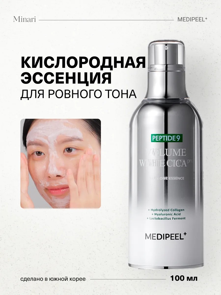 Medi-Peel Peptide 9 Volume White Cica Essence, a brightening oxygen essence with centella, soothes irritated skin, relieves itching and inflammation, and evens out overall skin tone.