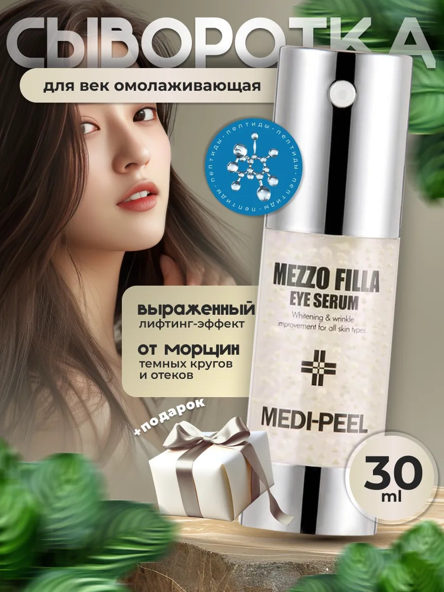 The rejuvenating peptide eye serum Medi-Peel Mezzo Filla Eye Serum has a pronounced lifting effect, smoothes expression wrinkles around the eyes and nasolabial folds, has a revitalizing effect, and tones, moisturizes, and gently brightens dark circles.