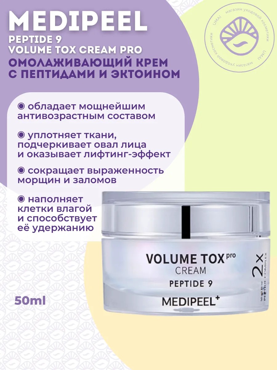 MEDIPEEL Peptide 9 Volume Tox Cream PRO, a rejuvenating cream with peptides and ectoine, actively combats age-related changes: dryness, thinning of subcutaneous fat, and tissue ptosis.