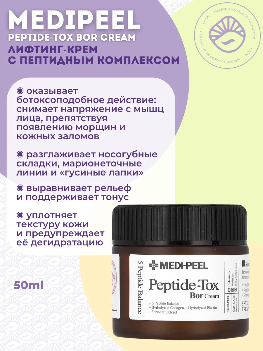 Medi-Peel Peptid-Tox Bor-Cream, a lifting cream with a peptide complex, has a pronounced anti-aging effect: it improves skin firmness and elasticity, reduces wrinkle depth, and smoothes the facial contours.