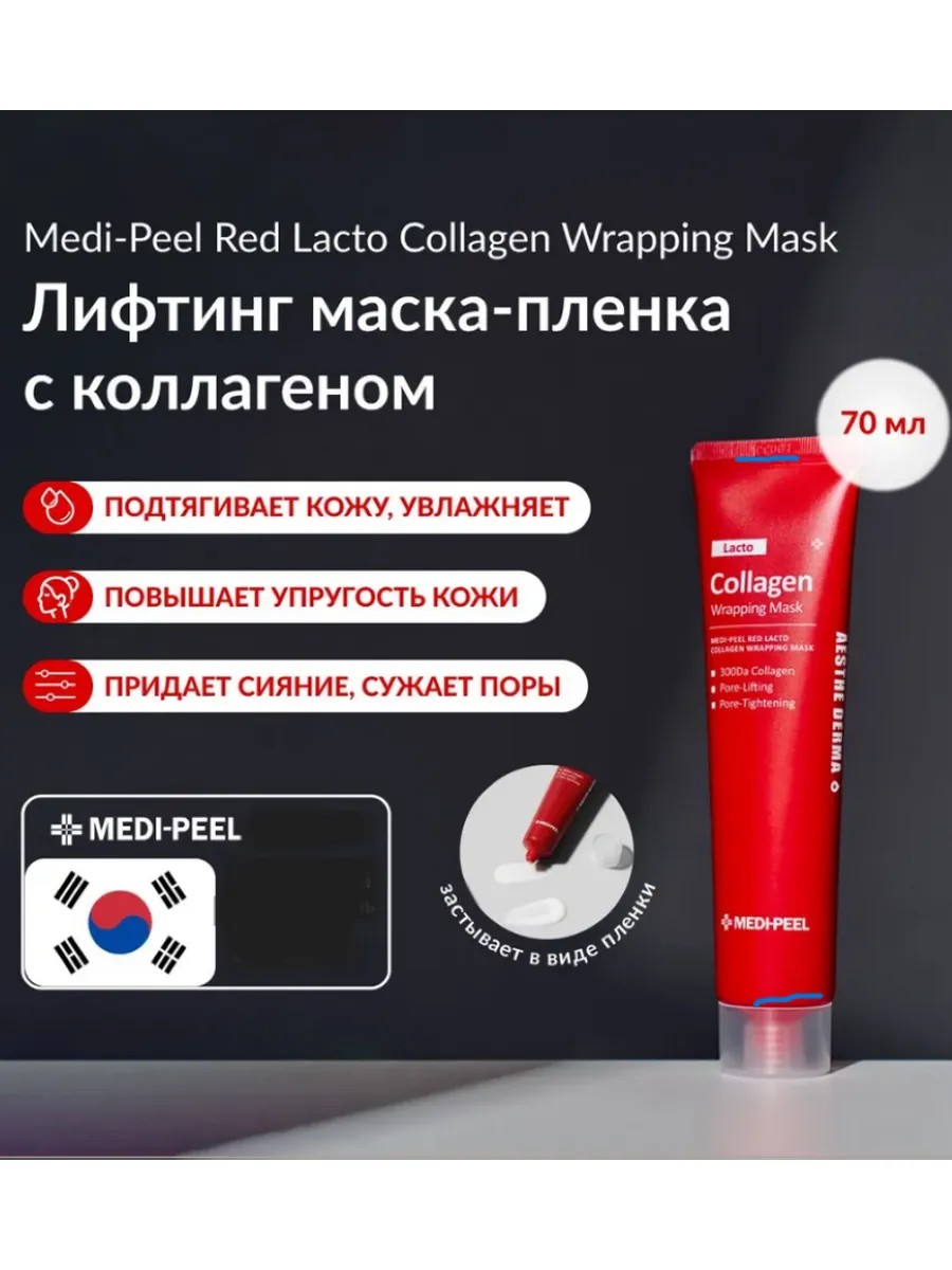 Маска-плёнка Medi-Peel Red Lacto Collagen Wrapping Mask — это нежный гель, который застывает на коже, подтягивает и сужает расширенные поры, делая их менее заметными. Маска сокращает размер пор, уменьшает их глубину, сглаживает микрорельеф. Средство устраняет жирный блеск, нормализует активность сальных желёз, повышает упругость и эластичность, разглаживает, придаёт здоровое сияние. Питательная кремовая текстура плотно прилегает к коже, образуя дышащую коллагеновую мембрану, которая позволяет компонентам проникать в кожу. Формула основана не на воде, а на 70,2% гидролизованном коллагене (702,278 ppm) с низким молекулярным весом 300 Da (дальтон), за счёт чего актив проникает глубоко в эпидермис, увлажняет и омолаживает. Коллаген повышает прочность тканей, укрепляет, стимулирует выработку собственной гиалуроновой кислоты, уменьшает видимость возрастных изменений. Подходит для комбинированной и жирной кожи.