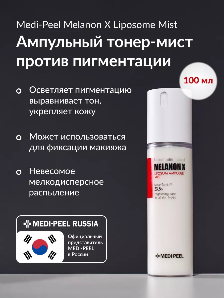 Тонер для лица Medi-Peel Melanon X Liposome Ampoule Mist - это средство в виде спрея, которое помогает выровнять тон кожи и бороться с пигментацией.