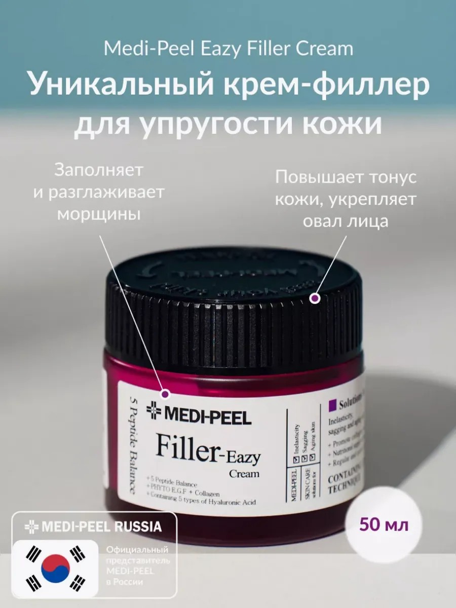 Medi-Peel Eazy Filler Cream, a nourishing filler cream, improves skin firmness and elasticity, reduces the appearance of wrinkles, and slows the appearance of age-related changes in the forehead, eye area, and nasolabial folds. It firms, plumps, smooths, and softens the skin, provides a lifting effect, evens out microrelief, and imparts a healthy glow. This cream has a viscous texture, nourishes, and moisturizes, preventing dryness. It contains the Matrixyl3000 complex (Palmitoyl Tripeptide-1, Palmitoyl Tetrapeptide-7), consisting of matrikines—signaling peptides that stimulate skin cell activity, strengthen the extracellular matrix, and stimulate collagen synthesis, thereby reducing wrinkle depth and maintaining skin's smoothness. Argireline (Acetyl Hexapeptide-8) is responsible for the botulinum-like effect: the peptide promotes relaxation of facial muscles, thereby preventing the appearance of expression wrinkles and reducing the appearance of existing ones. The formula also contains copper peptide (Copper Tripeptide-1), an anti-inflammatory peptide that stimulates regeneration, promotes healing, and has an anti-aging effect, slowing skin aging.