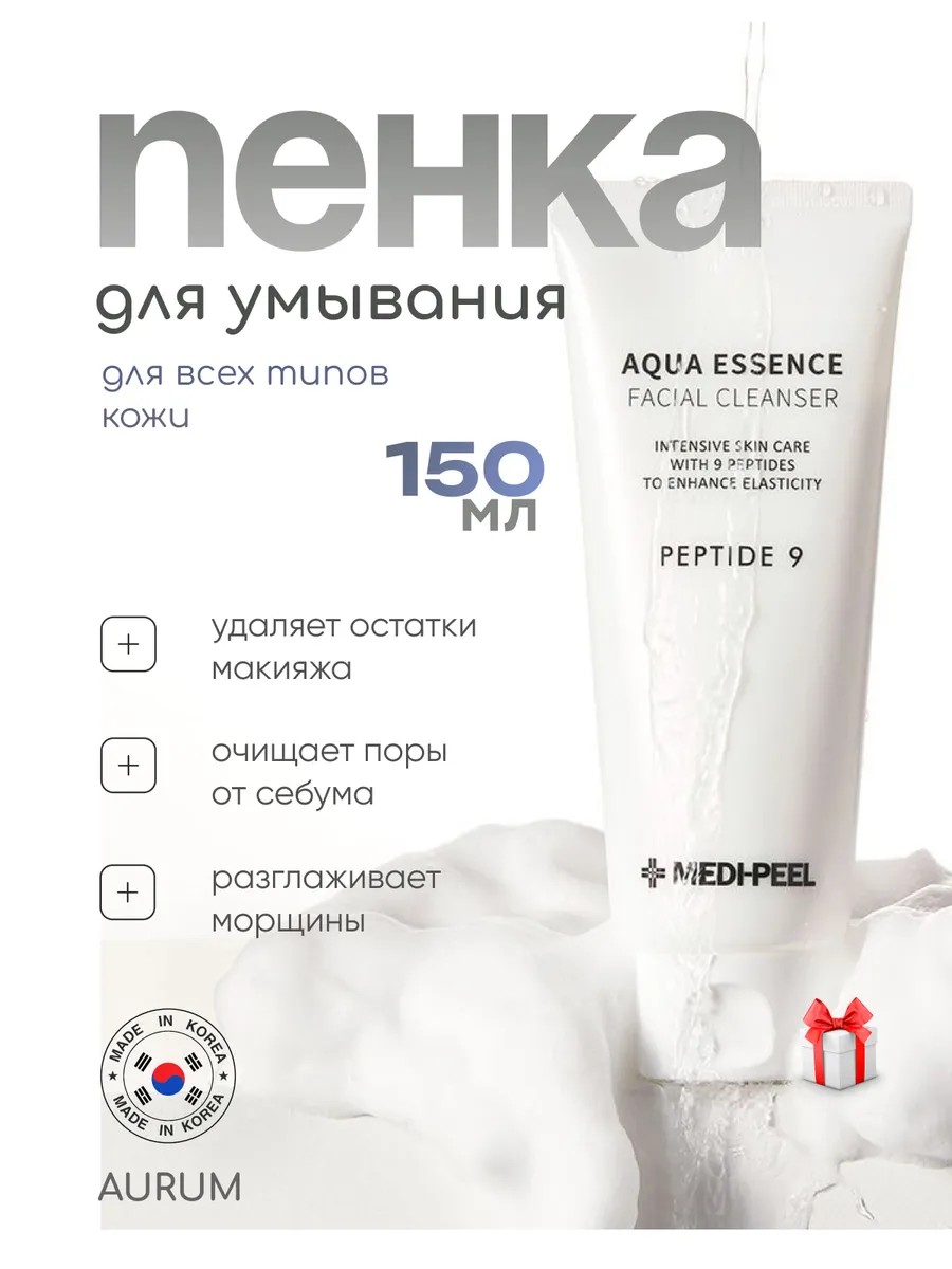 Medi-Peel Peptide 9 Aqua Essence Facial Cleanser, a moisturizing cleansing foam with peptides, thoroughly removes impurities and makeup residue from the skin's surface, unclogs pores, and removes excess sebum.