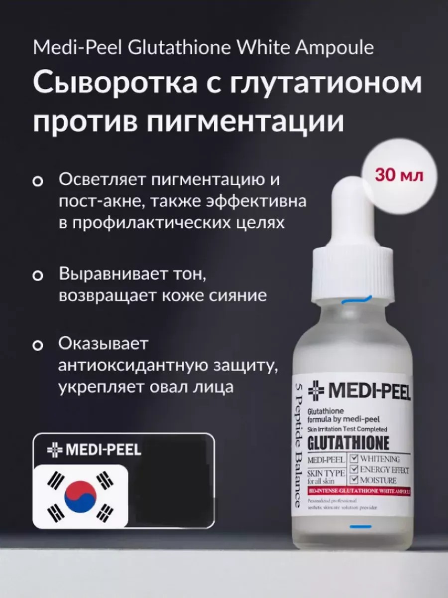 Осветляющая ампульная сыворотка с глутатионом Medi-Peel Bio-Intense Glutathione White Ampoule обладает ярко выраженным отбеливающим действием, снимает красноту, выравнивает тон кожи, помогает в борьбе с пигментацией и постакне.