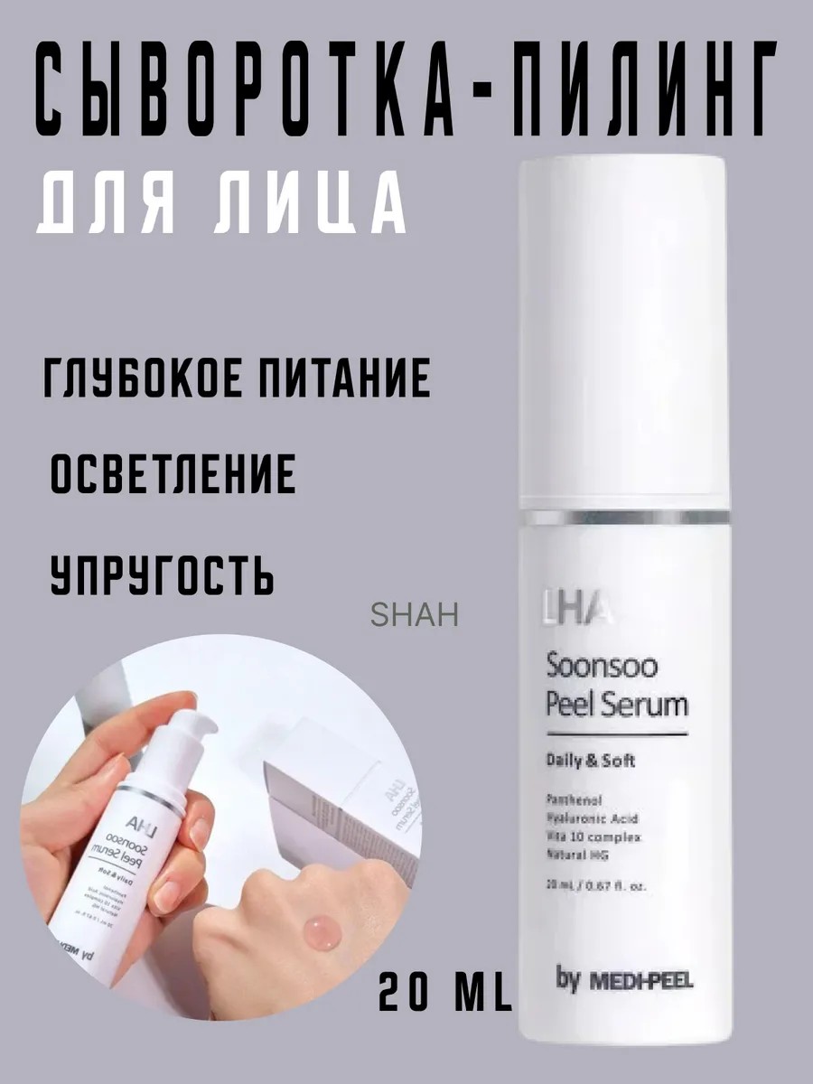 Medi-Peel LHA Soonsoo Peel Serum, a hypoallergenic peeling serum with lipohydroxy acid, removes dead epidermal cells and impurities without irritation.