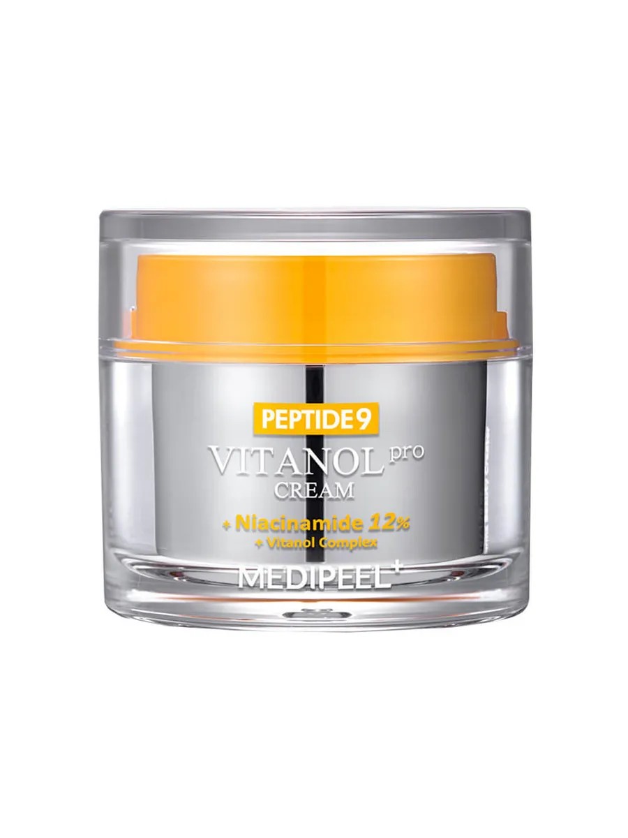 Medi-Peel Peptide 9 Vitanol Cream Pro This innovative face cream combines a high concentration of niacinamide (12%) and a unique vitanol complex, including vitamins A, E, F, and K, to specifically combat dark spots and discolorations, providing effective skin whitening. The key feature of this product is the presence of nine types of peptides, which, when combined with niacinamide, create a strong synergistic effect. This promotes intensive care of deep pigment spots, gives the skin radiance, improves its tone and overall condition, making the skin more elastic and firm. Unique double-coating technology with vitamin C maximizes the effectiveness of the delivery of active ingredients to the deep layers of the skin, guaranteeing their stability and activity, which contributes to a significant improvement in complexion and a reduction in the appearance of dark spots. The cream formula is enriched with adenosine, collagen, and ectoine, which help improve skin elasticity and intense hydration, keeping the skin soft and smooth to the touch. The cream's texture is rich and nourishing, yet easily absorbed without leaving a greasy or sticky feeling, providing long-lasting hydration and comfort. Dermatologically tested for irritation, it is safe and suitable for daily use at any age and for all skin types seeking perfection and a healthy glow. What concerns does it address: Deep pigmentation spots, Uneven skin tone, Dullness and loss of radiance, Signs of aging such as fine lines and wrinkles, Loss of firmness and elasticity, Dryness and flaking, Inflammation and redness, Aging and loss of vitality. Directions: At the last step of your skincare routine, take an appropriate amount of cream and apply evenly to your skin.