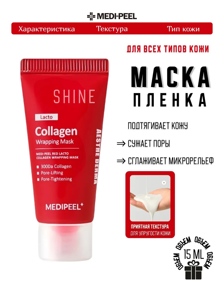 Маска-плёнка MEDIPEEL Red Lacto Collagen Wrapping Mask — это нежный гель, который застывает на коже, подтягивает и сужает расширенные поры, делая их менее заметными. Маска сокращает размер пор, уменьшает их глубину, сглаживает микрорельеф.