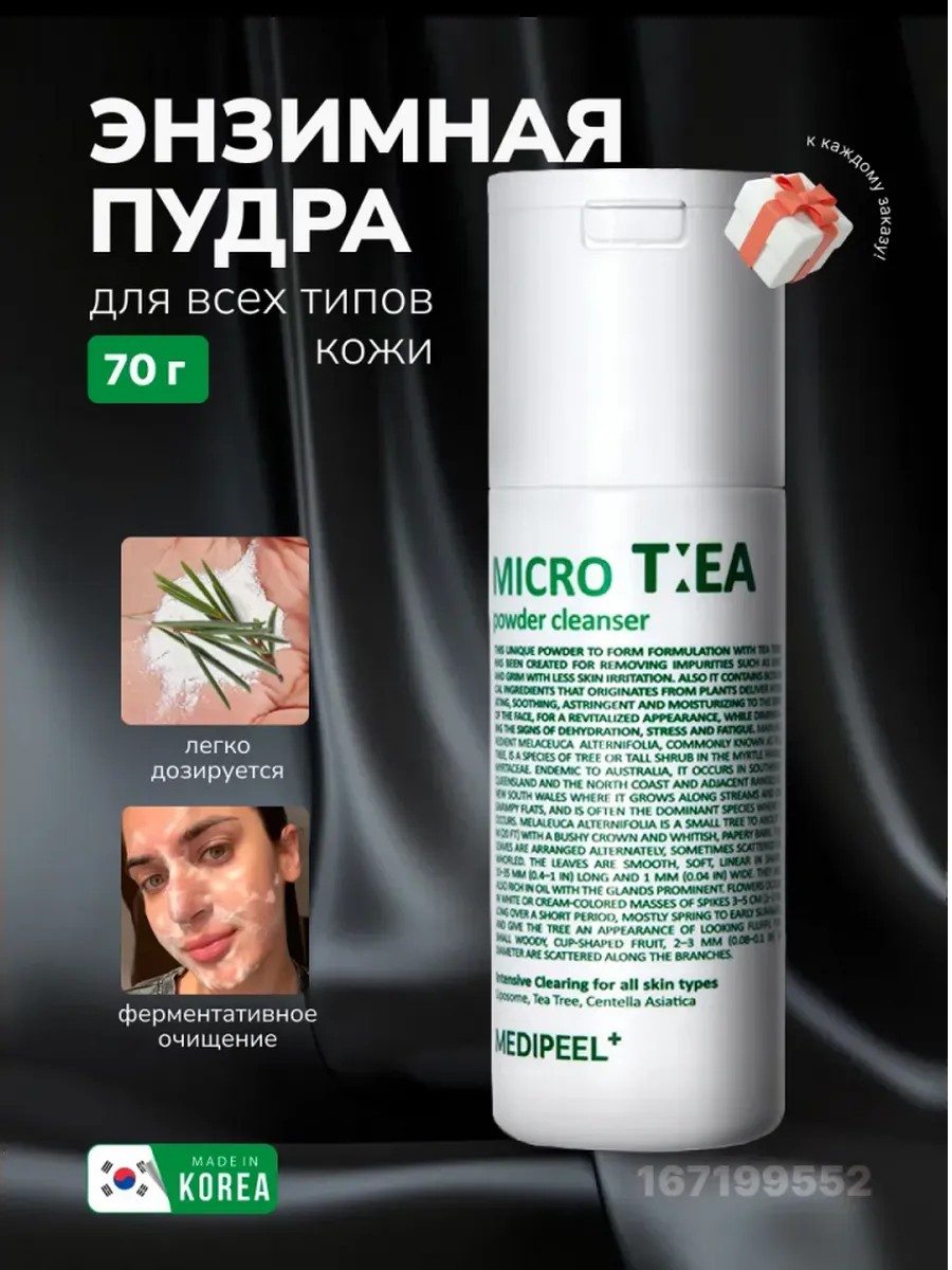 The Korean enzyme powder with tea tree, Medi-Peel Micro Tea Powder Cleanser (70g), removes everyday impurities, effectively cleanses pores, gently exfoliates dead skin cells, and has an anti-inflammatory and soothing effect. This deeply cleansing Korean enzyme powder cleanser from a Korean brand provides intensive cleansing without over-drying the skin. It removes all types of impurities, dust, excess sebum, and stubborn makeup, dissolves sebum plugs, and eliminates oily shine. This Korean facial cosmetic regulates sebum production, tightens pores, and evens out skin texture. One of its key advantages is its extremely economical use. Even with constant use several times a week, one package lasts 10-12 months. The cleanser effectively dissolves impurities thanks to a complex of natural surfactants. Contains a protease enzyme that clears pores of sebum and gently exfoliates. It's enriched with an anti-inflammatory complex based on tea tree oil and two salicylic acid derivatives. It doesn't dry out the skin thanks to a complex of hyaluronic acids of varying molecular weights. pH 5.5. This enzyme powder is suitable for both women and men, gently removing impurities and excess oil. The micro-formula with salicylic acid promotes effective exfoliation, helps combat acne and pimples, and improves the condition of sensitive skin. The enzyme composition deeply cleanses pores, tightening them and preventing breakouts. The powder forms a light lather when combined with water, making cleansing a pleasant experience. It's an excellent choice for both men and women seeking beautiful and healthy skin. It contains mineral components that nourish the skin at the cellular level and is non-irritating. This original Korean product will be a great addition to your beauty routine. Take care of your body and skin with this amazing enzyme formula!