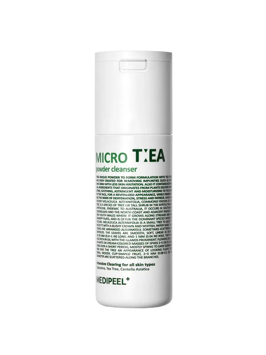 The Medi-Peel Micro Tea Powder Cleanser, a deep-cleansing enzyme powder with tea tree, provides intensive cleansing without overdrying the skin. It removes all types of impurities, dust, excess sebum, and stubborn makeup, dissolves sebum plugs, and eliminates oily shine.