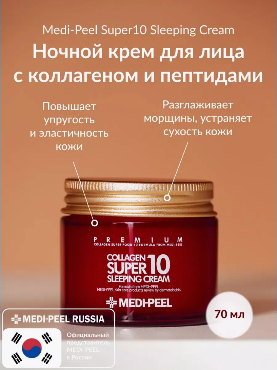 Ночной крем с коллагеном и ферментами для лица с омолаживающим эффектом от Medi-Peel Collagen Super10 Sleeping Cream - это средство, разработанное для эффективного ухода за кожей во время сна. Крем обладает небольшой молекулярной массой, что позволяет активным компонентам проникать глубоко в кожу, обеспечивая максимальную эффективность.