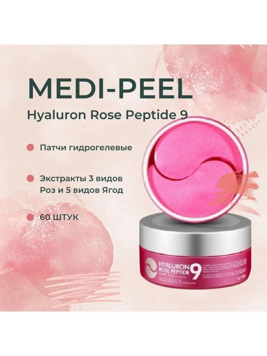MEDI-PEEL Peptide 9 Hyaluron Rose Ampoule Eye Patch (60 rubles) Patches with peptides and Bulgarian rose: Main active ingredients: A complex of three rose extracts. It is a powerful antioxidant, neutralizes the negative effects of free radicals, instantly refreshes and moisturizes the skin, makes it soft and radiant. Berry extracts. They have moisturizing and strengthening properties, keep the skin toned, prolonging its youth. A complex of 9 peptides. Activates the ability of skin cells to restore and regenerate, starts the process of synthesis of collagen, elastin, slows down the aging process of the skin. MEDI-PEEL Peptide 9 Hyaluron CICA Ampoule Eye Patch (60 rubles) Patches with centella and a peptide complex: Soothing hydrogel patches with peptides. They quickly relieve irritation and inflammation, actively moisturize, and eliminate dryness, irritation, and flaking. Key active ingredients: Peptide complex. Provides a rejuvenating effect, helps smooth wrinkles, and maintains youthful skin. Centella asiatica complex and its derivatives. Moisturizes the skin, boosts its immune function, neutralizing the negative impact of external factors and UV radiation. Strengthens blood vessel walls, has a powerful antioxidant effect on the skin, and stimulates the synthesis of collagen types I and III. A complex of 9 peptides. Stimulates fibroblasts to synthesize collagen and elastin, restoring and improving skin texture, preventing the appearance of wrinkles. MEDI-PEEL Peptide 9 Hyaluron Aqua Ampoule Eye Patch ($0.60) Deeply moisturizing patches with peptides: Moisturizing hydrogel patches with hyaluronic acid, seaweed extract, and a peptide complex. They intensively hydrate dehydrated skin, help relieve dryness and tightness, have a gentle lifting effect, and help smooth out fine lines and wrinkles. Key active ingredients: A complex of 7 types of hyaluronic acid with varying molecular weights. Moisturizes the skin, creating an invisible moisture-retaining film on the surface of the epidermis, which in turn prevents dehydration. Laminaria extract, spirulina extract, and carrageenan. These components act as immunomodulators, strengthen the skin matrix, and improve skin tone. A complex of 9 peptides. Stimulates collagen and elastin synthesis in skin cells, thereby restoring elasticity. Prevents the formation of expression wrinkles. Beta-glucan. A powerful antioxidant that has a beneficial effect on the skin's immune system, enhances its ability to regenerate, soothes and reduces inflammation, deeply moisturizes and nourishes the skin, restoring the normal functioning of all cellular systems. Hydrolyzed collagen. Its small molecular structure allows for rapid absorption. Maintains the skin's ability to contract and stretch, returning to its original state without affecting the integrity and elasticity of the skin matrix. Medipil patches
