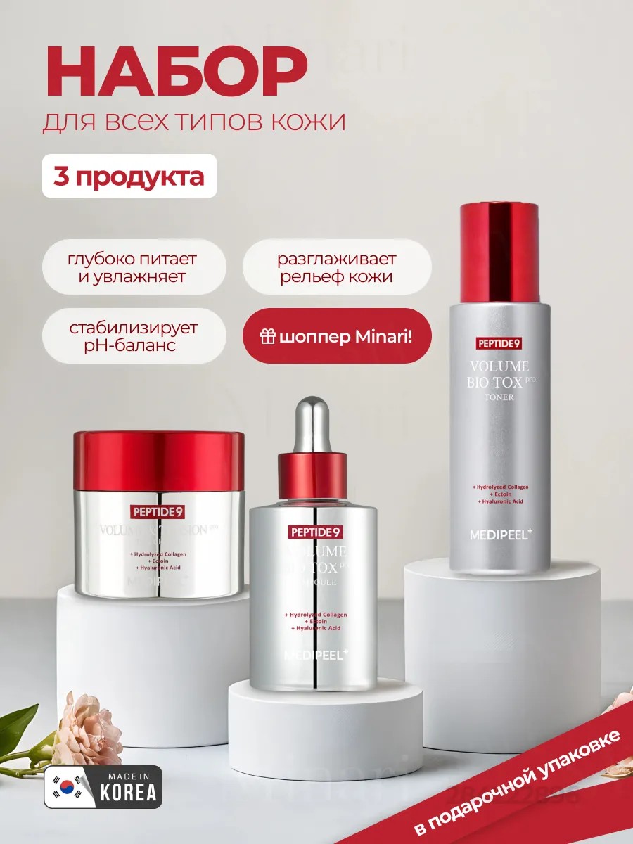 | Комплектация | тонер Medi-Peel Peptide 9 Volume Bio Tox Toner Pro 250мл; сыворотка Medi-Peel Peptide9 Volume Bio Tox Ampoule PRO 100мл; крем Medi-Peel Peptide9 Volume And Tension Tox Cream PRO 50г |