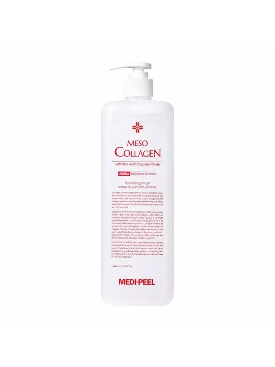 Medi-Peel Meso Collagen Toner - A refreshing collagen toner powered by the nourishing mesocollagen complex! Contains 10,000 ppm mesocollagen complex! Glycacid ECO booster that quickly restores collagen nutrition. Replenishes collagen for hydrated and elastic skin! Long-lasting hydration thanks to triple moisturizing ingredients. Large-capacity collagen toner (1000 ml). Enough to even use on your body! Apply toner to a cotton pad to refine skin texture and use it as a mask! Hypoallergenic formula, safe even for sensitive skin. EWG ALL GREEN certified, 20 warning ingredients, 26 allergen-free ingredients, and hypoallergenic tested, safe for sensitive skin. How to use: After cleansing, gently buff skin texture from the outside with a cotton pad.